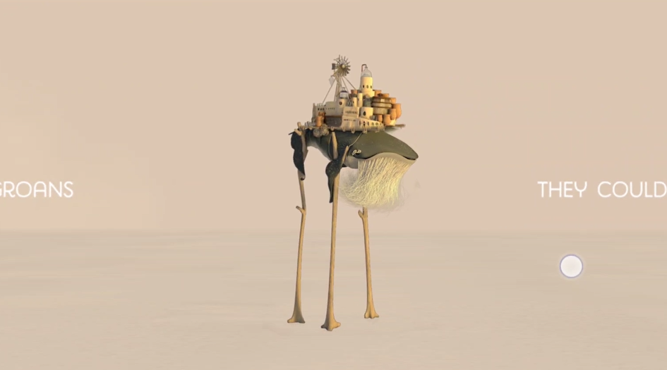 老鲸鱼前鳍和尾巴撑着三根高跷,在陆地上行走,它的背上背着一座城堡,仔细看城堡里住的都是“罐装”的海洋居民。