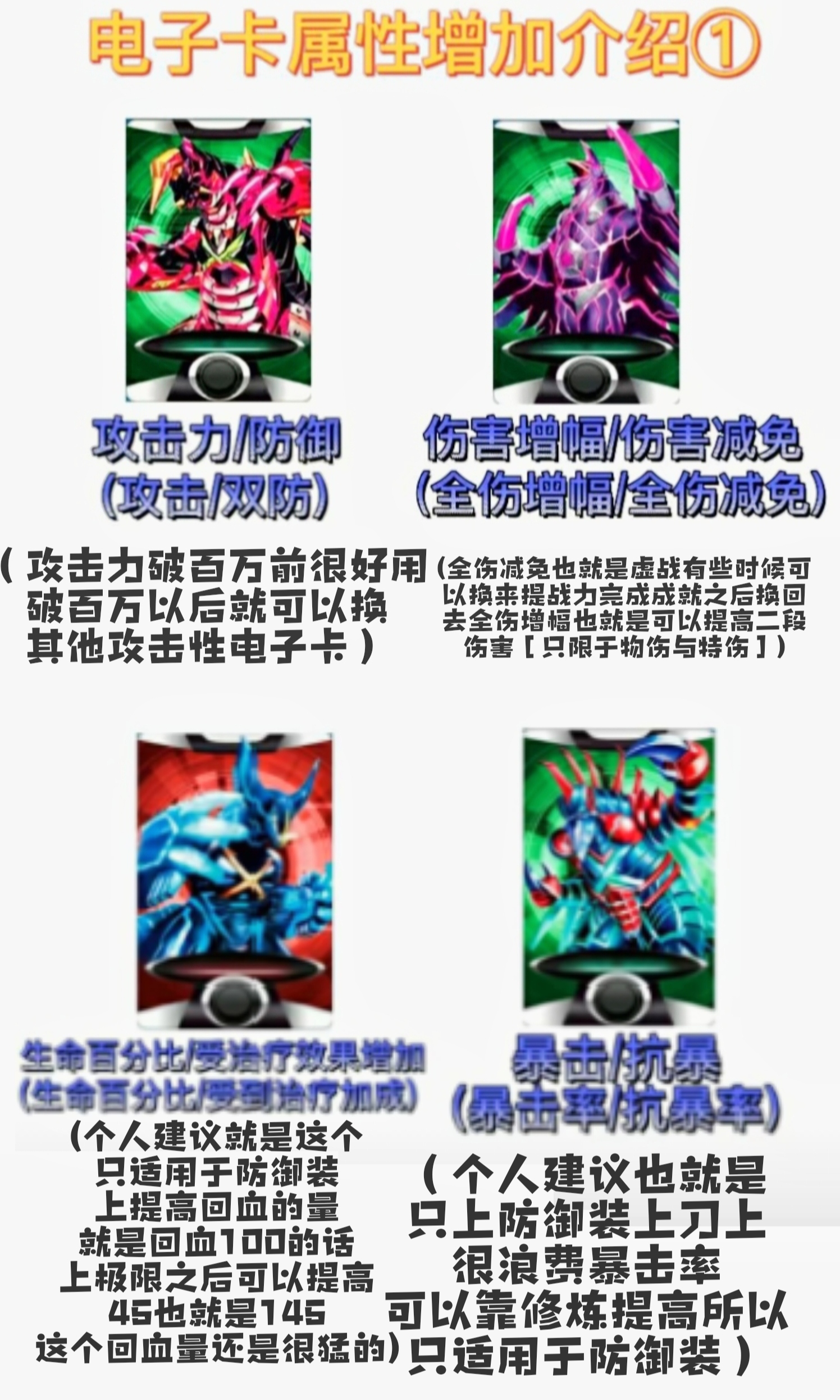 2.全伤减免电子卡,适用于炮灰角色用来拉高战力,也可有效针对受伤率阵容。这里插一句,全免可以瞬间抬高战力,用于过成就以及推本战力达标战力的可以用全免电子卡使战力达标,报完名再换回即可,抗爆流可再加上韧性电子卡达标后换回,毕竟电子卡比换修炼方便多了
