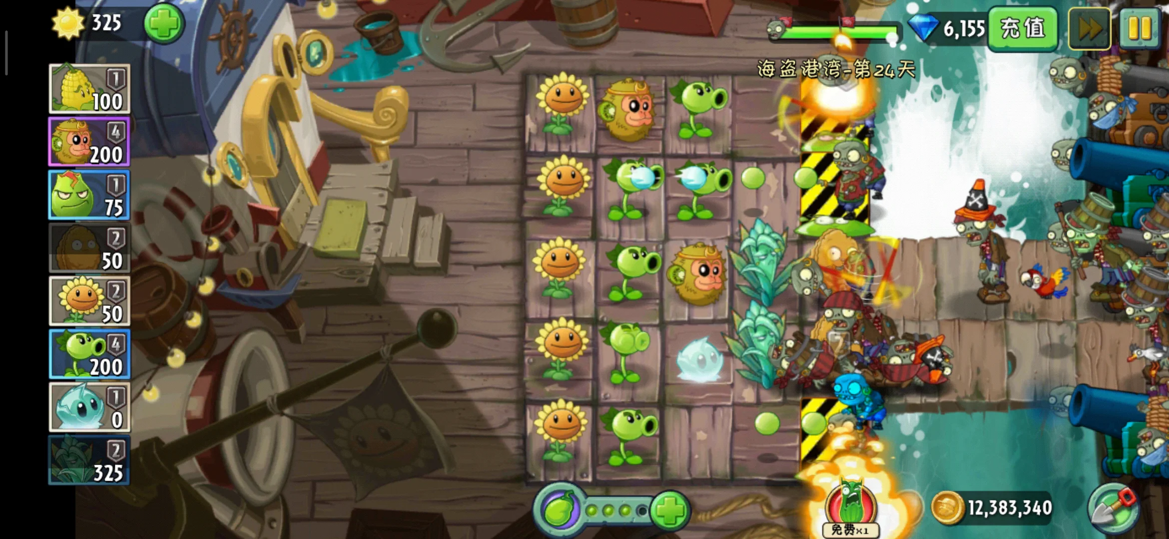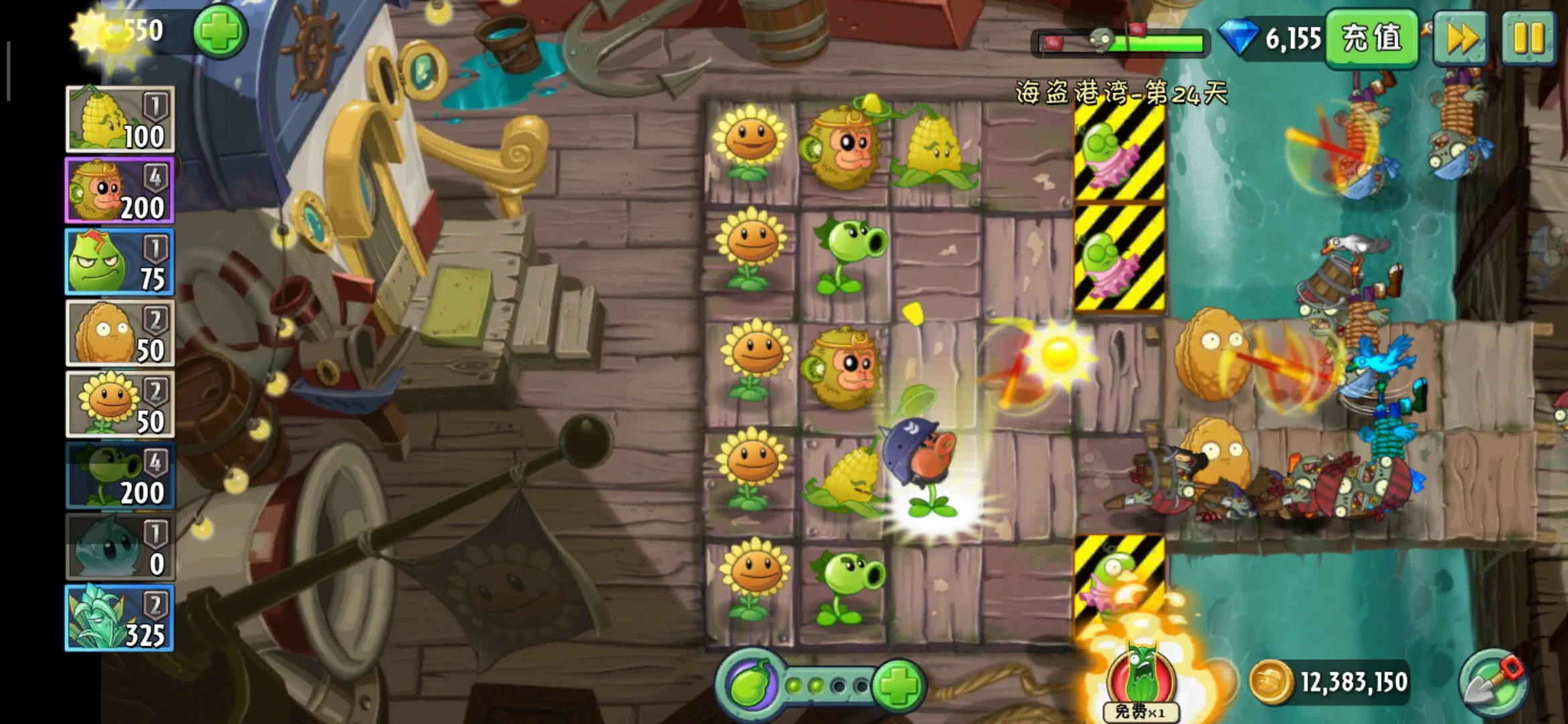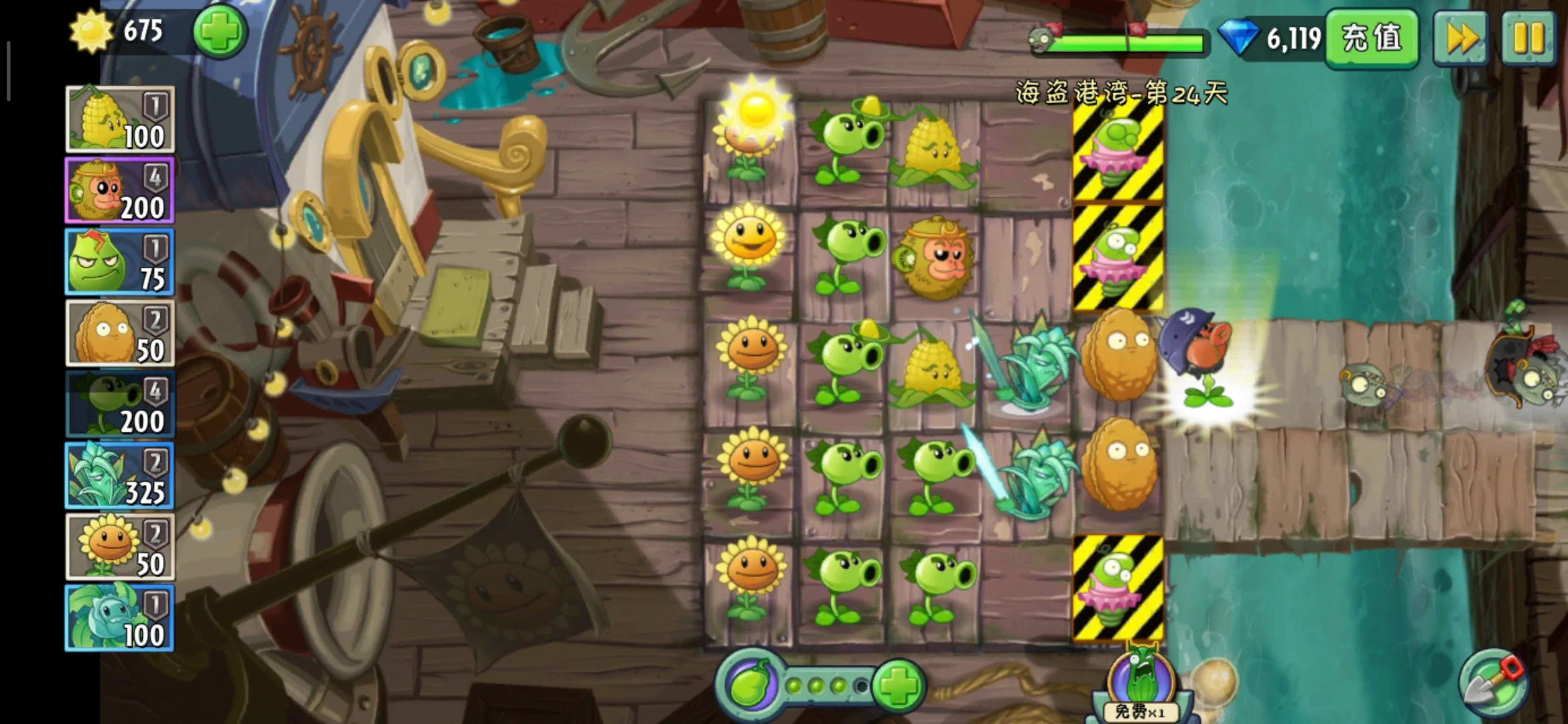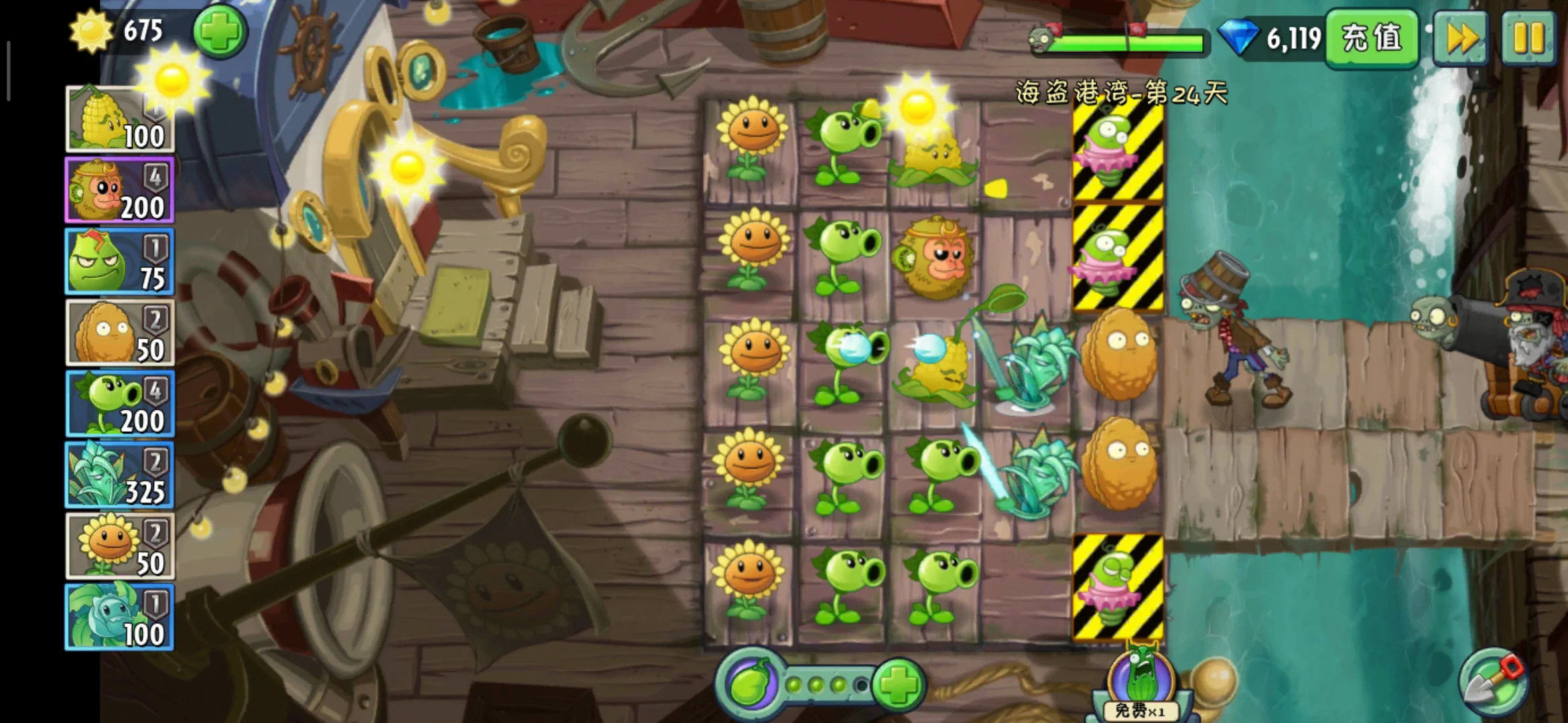 中间的很简单应付,我们种上两列坚果,让僵尸啃去吧,怎么着不得啃半天,但是,种植坚果的时候一定要注意,要从甲板的末端开始往前种植坚果,因为有飞索僵尸的存在。输出植物就可以随便定了,伤害越高越好,因为有铁桶僵尸,可以出龙舌兰这种穿透强伤害高的植物,太阳消耗不必在意,后期的太阳足够用。