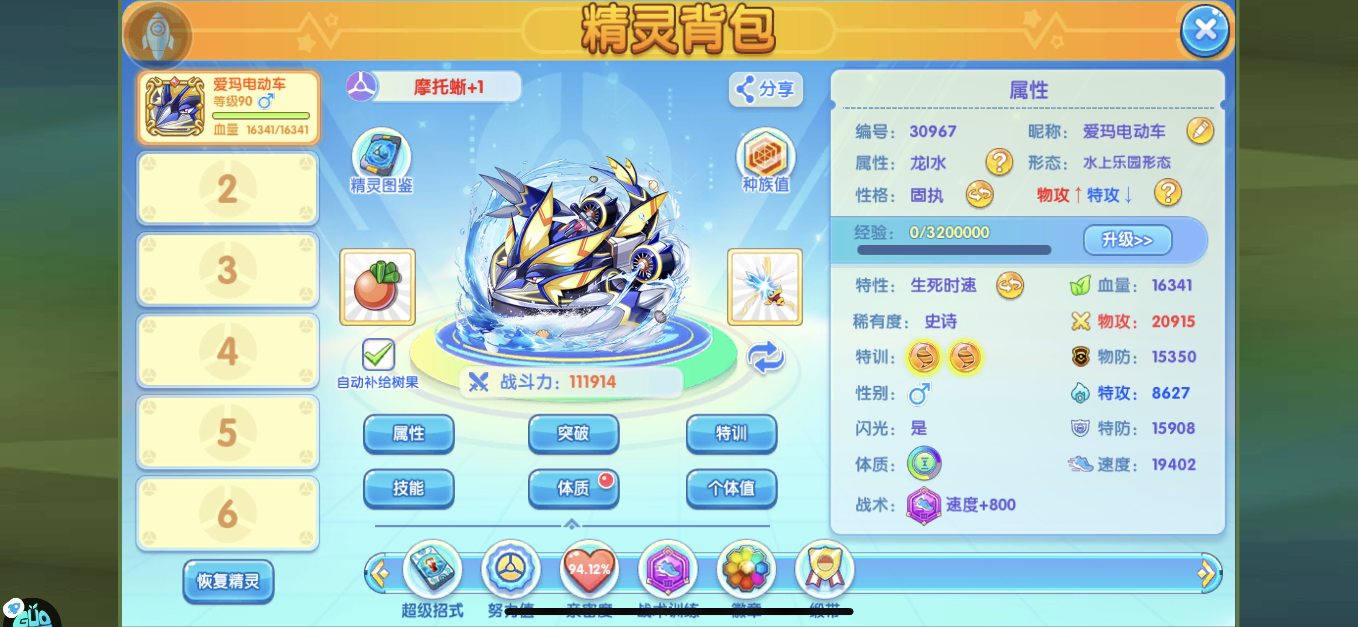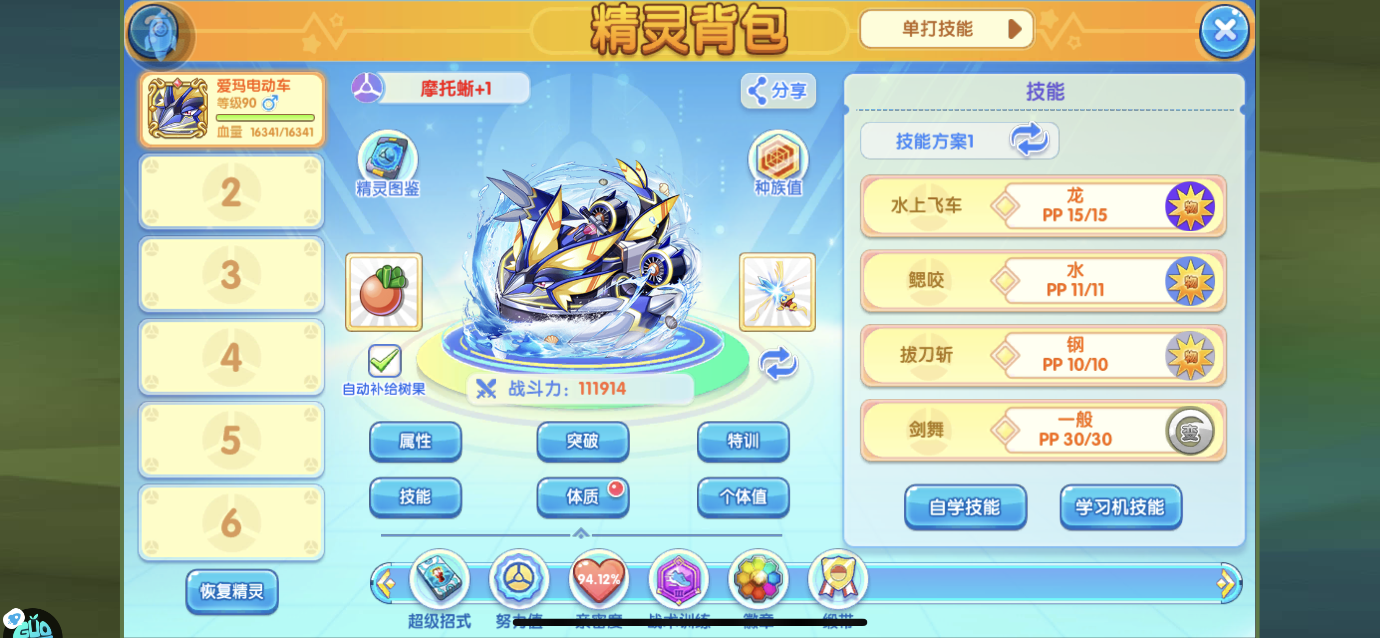 说明:摩托蜥能学的技能其实是有不少的,不过个人是比较推荐4攻的搭配,它的技能搭配其实很死板,水上飞车和腮咬这两个技能必带,这里说下水上飞车技能,威力100,Pp15,根据自身的第一属性给对方造成对应属性的伤害,比如对摩托蜥来说这就是龙属性技能,根据自身物攻/特攻的高低,改变该技能的类型,摩托蜥就是物攻,所以这也是物攻技能。最关键的是特效,出场首先使用该技能时,技能威为增加100,但其它技能将会无法使用,反之则该技能将会无法使用,如果是限定路线,那么无脑飞车飞车猛突,其他技能就选择腮咬、拔刀斩、三击流等,遇到对方妖精系联防了可以用别的攻击,弱点刺钉主要针对物攻手天敌召唤火,不过也有带交换齿轮或者剑舞的,想着如果被落拳了,也可以用其他技能,这种玩法就是炮台玩法。