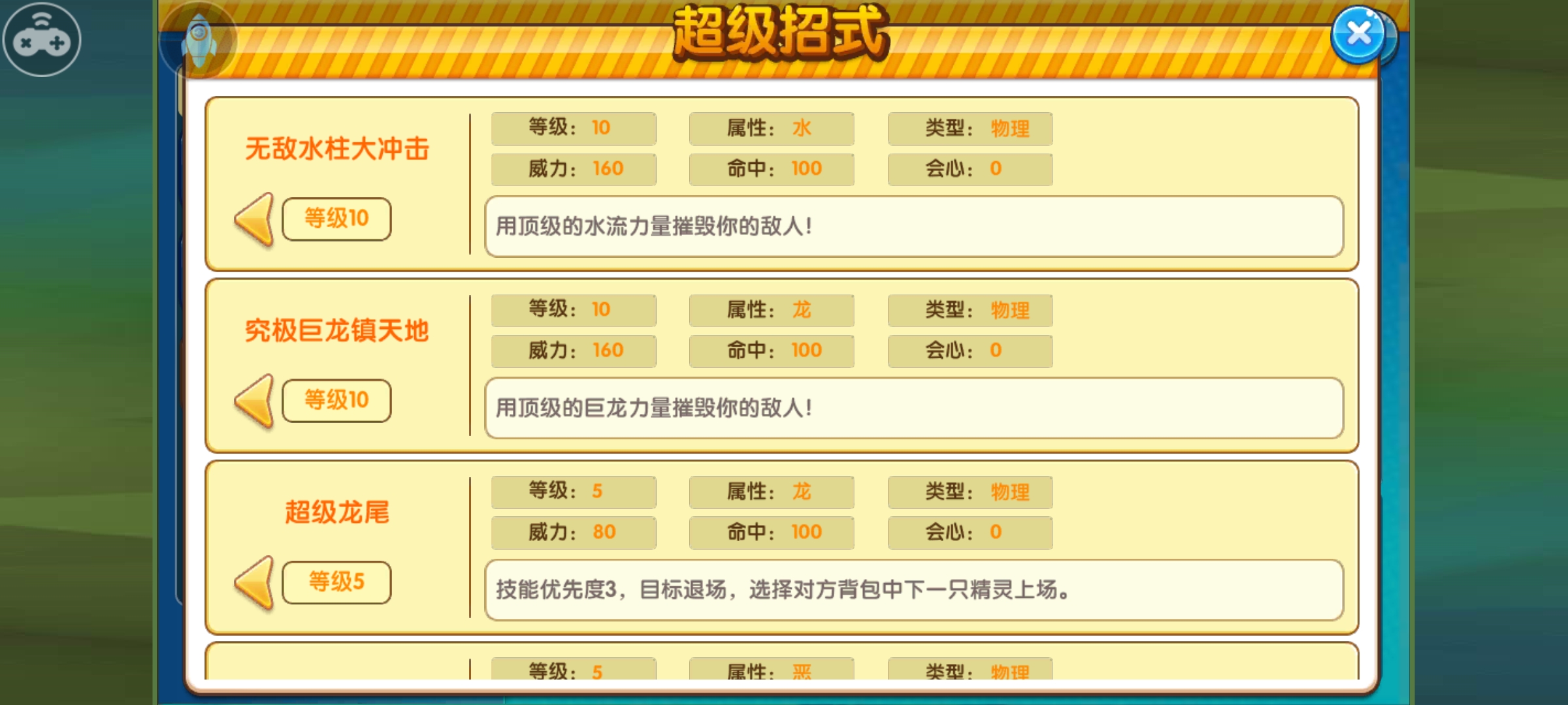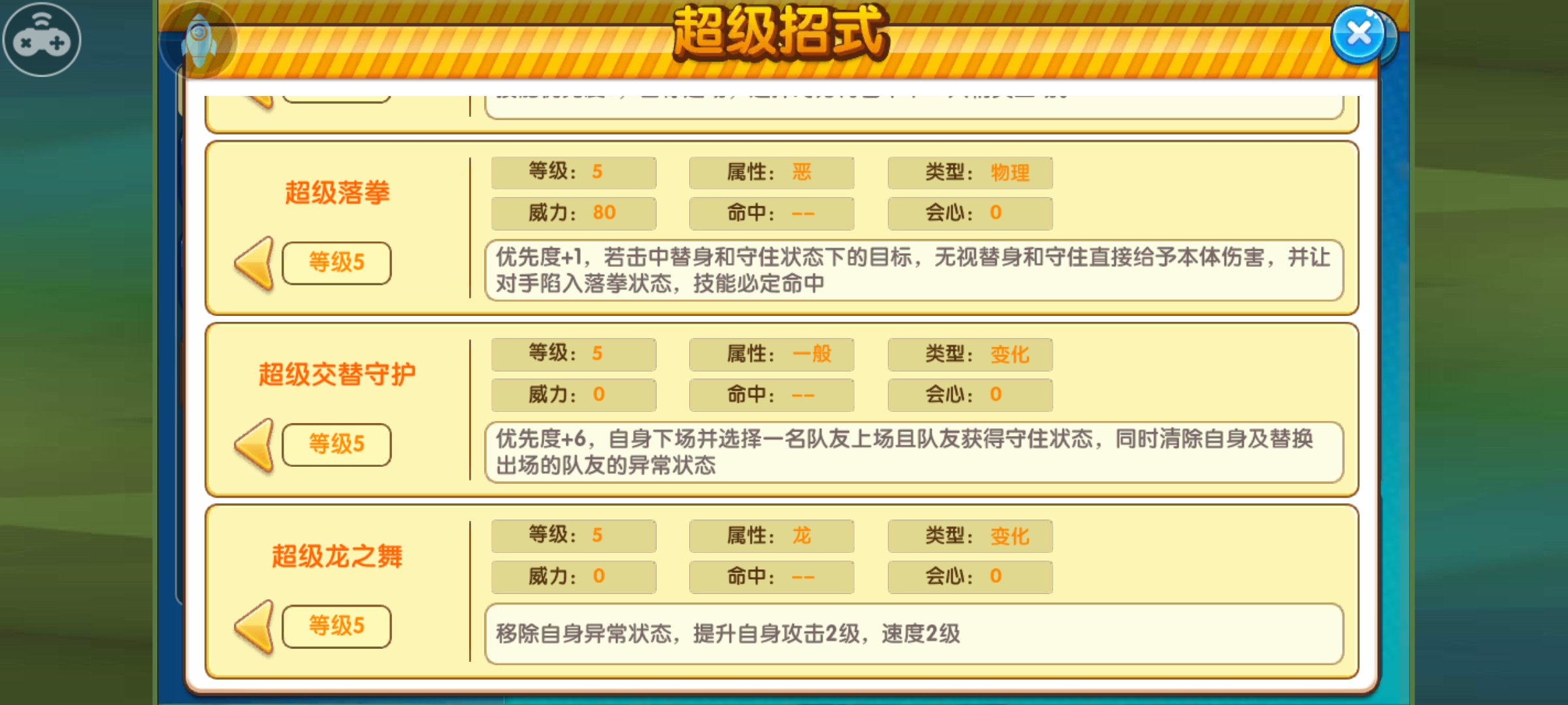 它的超级大招除了有威力160的龙本和水本,还有超级龙尾以及超级龙舞、超级落拳等,个人推荐超级龙尾,容错率很高,遇到情况可以先制甩走。还有超级龙舞,可以强化后进行狂暴输出,另外超级然落拳是不是本系,但是有先制效果和将对方落拳效果,以及恶属性可以补盲,带了可以,就看大家队伍需求了。