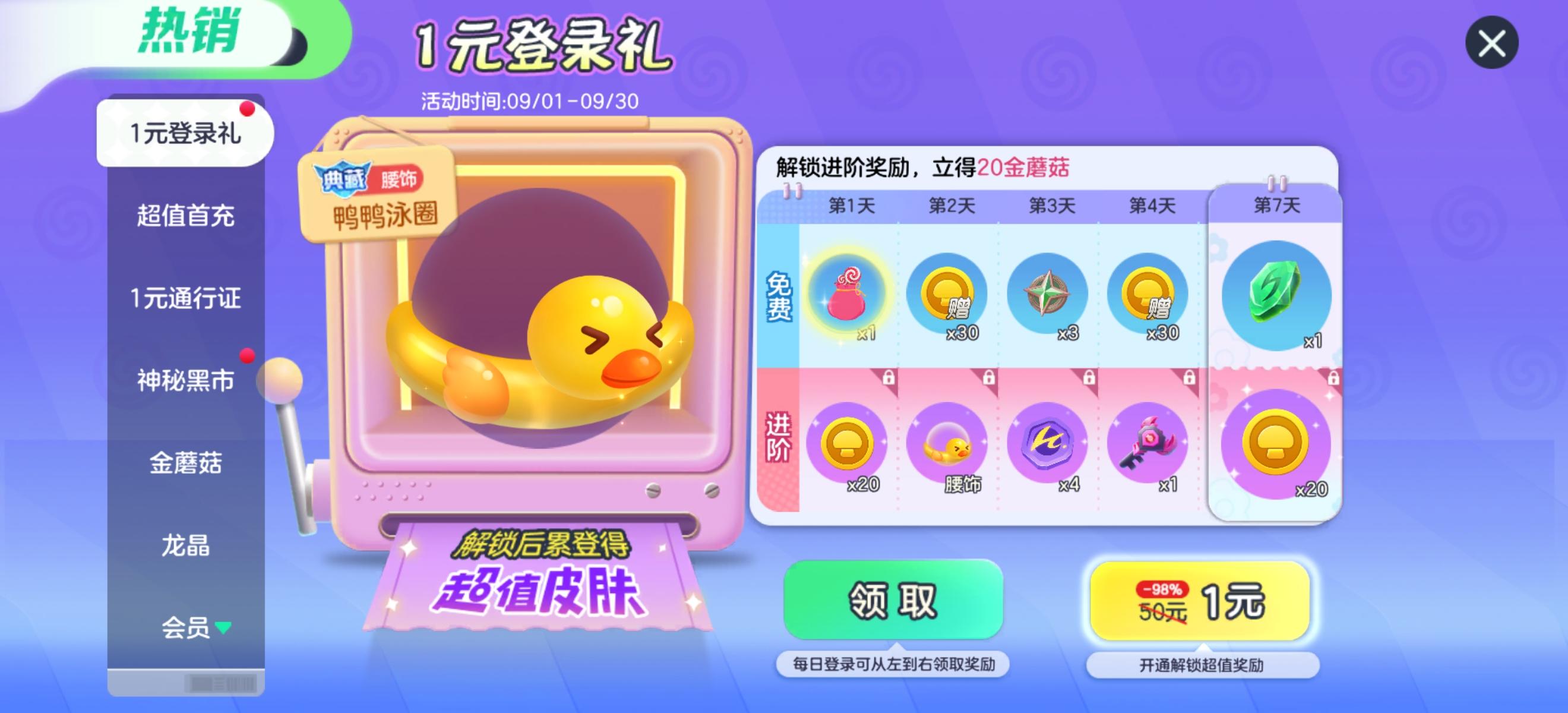 每日登录就有好礼相赠~仅需1元即可解钱进阶福利!典藏腰饰「鸭鸭泳圈」、超大奇妙宝箱钥匙等超值奖励等你来领!