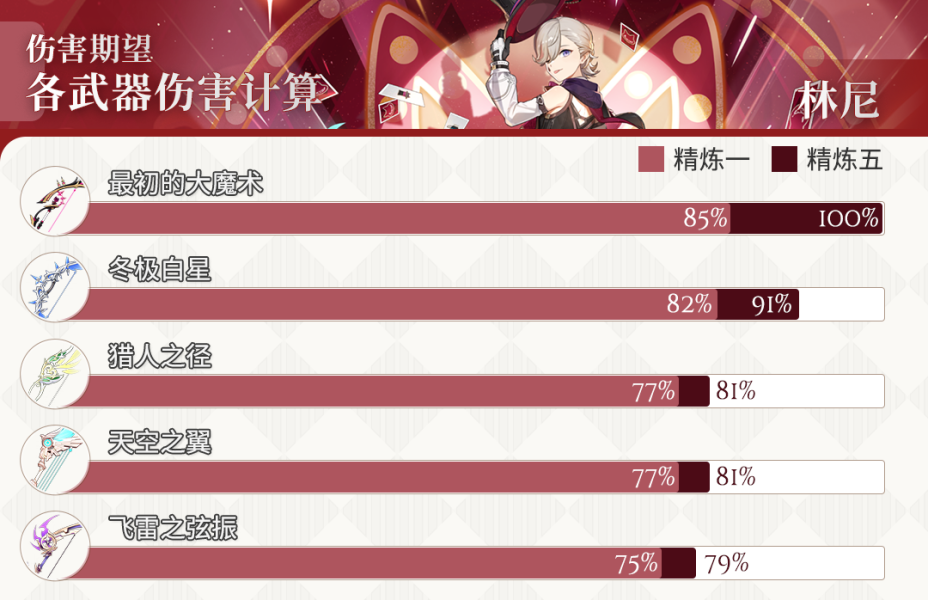 林尼的专属武器,不仅外观契合,武器本身也很契合。林尼作为枫丹版本的开国C,却需要纯火的玩法,在三火一万叶的队伍中即可吃满武器的被动效果。