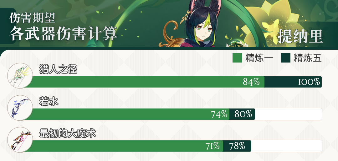 同样是二段蓄力重击玩法的提纳里,大魔术弓一般按照吃两层计算,计算结果如上图。这期卡池可以说赚麻了,如果没有抽过猎人之径,可以尝试捞一下若水&大魔术池,抽到二者其一都可以用,相比其他武器提升不小。