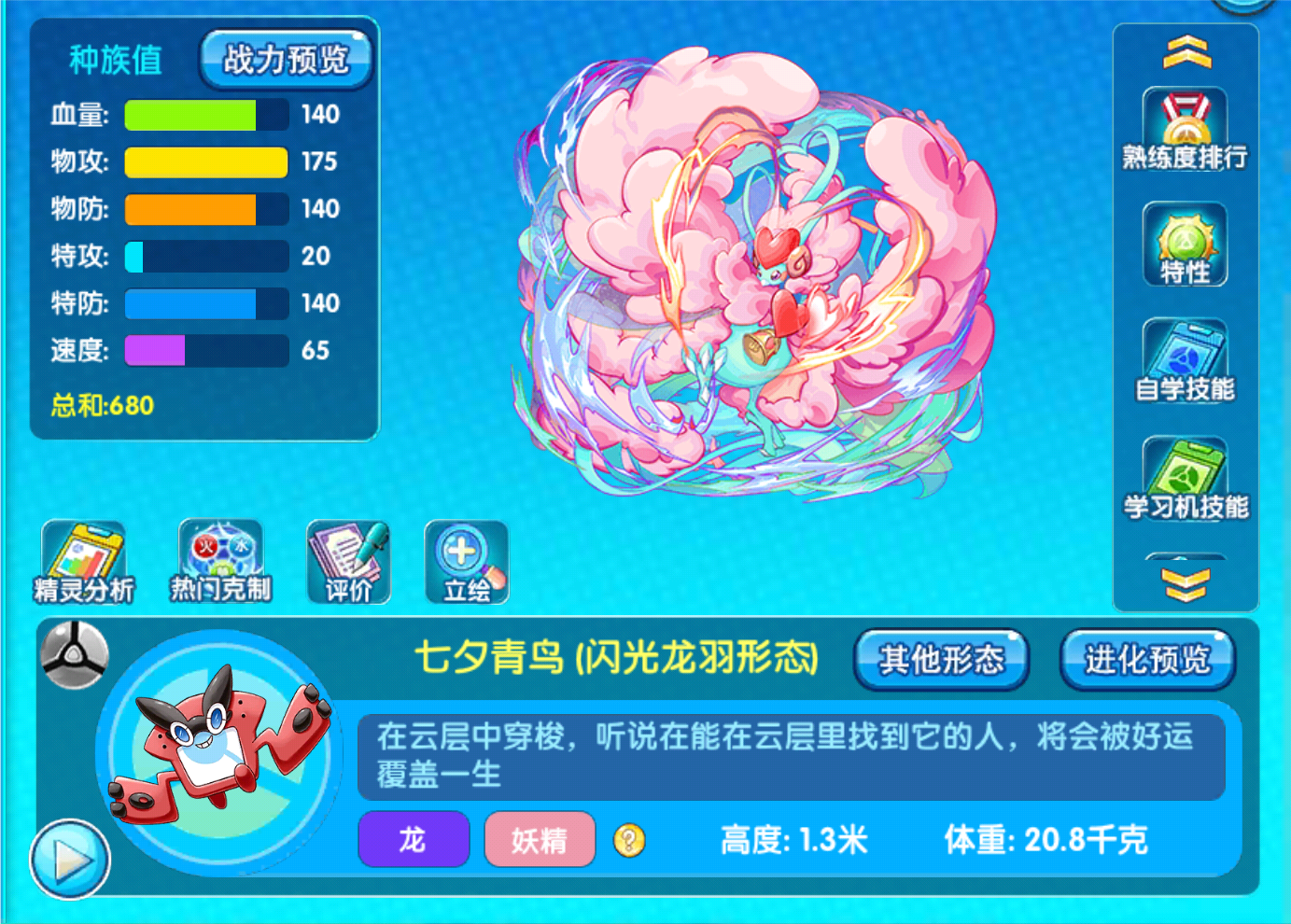 龙羽七夕青鸟整体属性还是不变的,依旧保留了龙加妖精整体来说,这个属性配置还是比较不错的,最大的缺点莫过于是直接继承了妖精属性的弱点毒属性和钢属性,当然了,还不要忘了龙属性的弱点冰属性,但是整体的抗性那就非常的不错了,毕竟龙属性的抗性本身就比较不错,再结合妖精属性,完全可以在当前版本解决一些恶心人的宠物,例如噩梦神土龙这些。