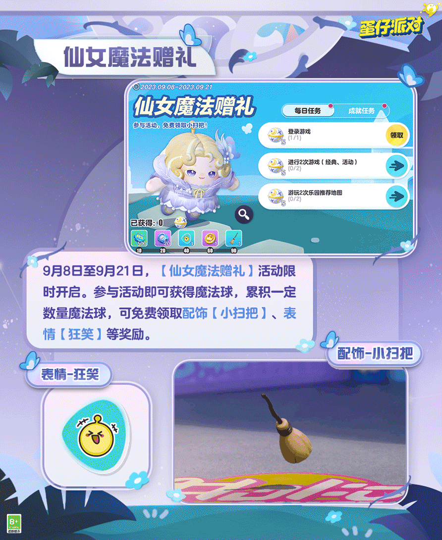 🦋9月8日-9月21日,【仙女魔法赠礼】活动开启,蛋仔们登录游戏并完成指定任务即可获得 【魔法球】,积攒一定数量的魔法球即可赢取配饰“小扫把”、表情“狂笑”等好礼[送花花]!