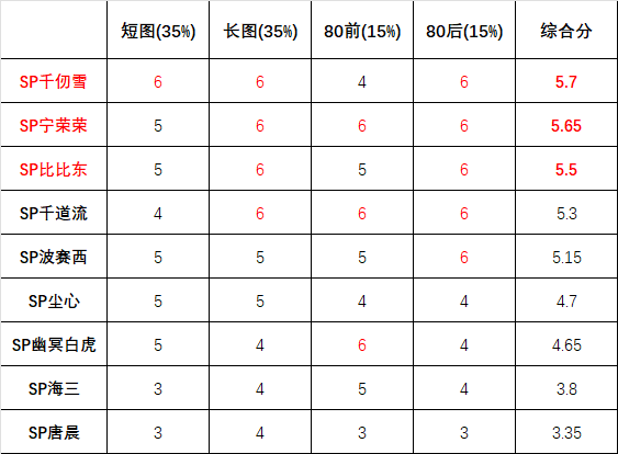 那么如果按照上述的评星,2星算2分、3星算3分......5星+算6分的话,这9位SP魂师的排名如下(鉴于玩PVP的玩家还是少数,所以短图和长图权重各占35%,PVP占30%):