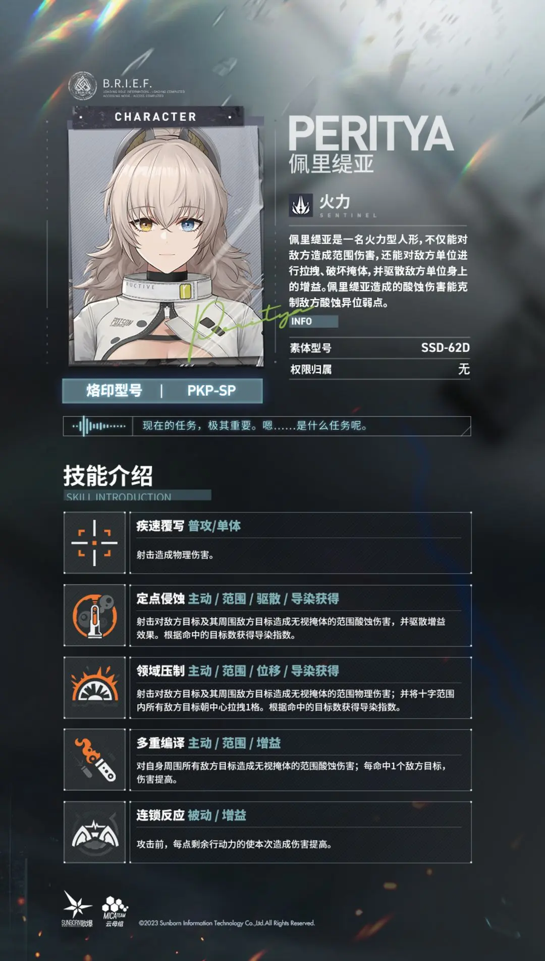 【技能情报】佩里缇亚技能情报公开!白喵岚岚发布于 2023-09-05关注佩里缇亚是一名火力型人形,不仅能对敌方造成范围伤害,还能对敌方单位进行拉拽、破坏掩体,并驱散敌方单位身上的增益。佩里缇亚造成的酸蚀伤害也能克制敌方酸蚀异位弱点。
