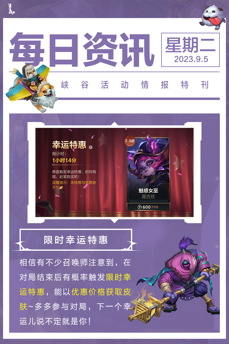 星光绽放,峡谷起航~手游品牌大使陈都灵邀请大家加入峡谷星光社团!各类活动、福利纷至沓来;娱乐玩法周周焕新,魔典大乱斗、星域系列、星之守护者皮肤陆续来袭。9月15日参与活动即送海克斯能量卡、陈都灵语音包等奖励,助你稳稳上分!更多内容将在未来陆续揭晓。