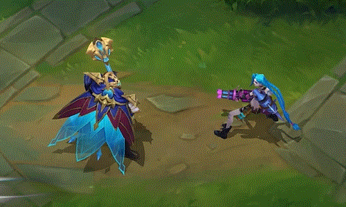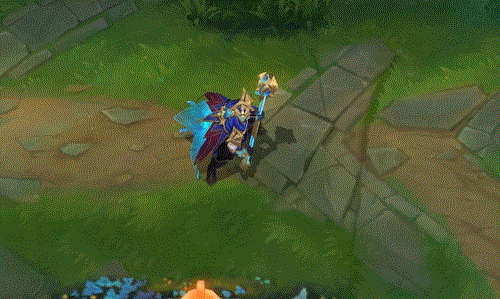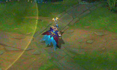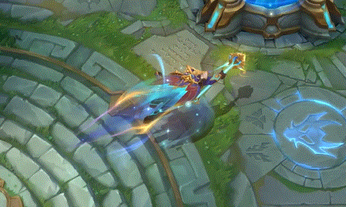 贾克斯用他的权杖开路,如彗星般轻快地在峡谷飞行。过程中贾克斯还会旋转他的权杖,背后的银河拖尾让他宛如真正的天上星神。