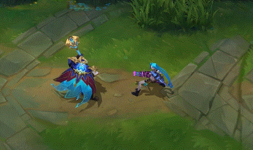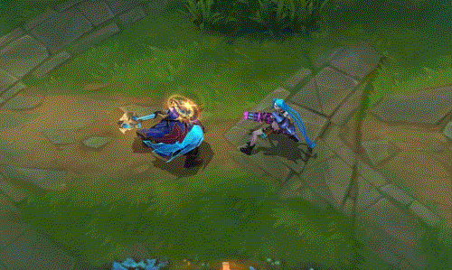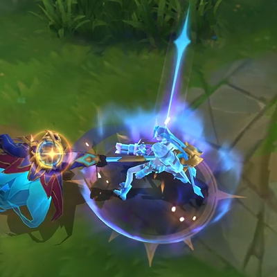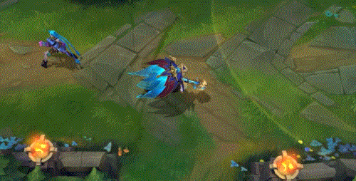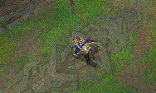 贾克斯跃向目标,起跳时会在原地留下根据贾克斯面向而指示的半月弓形印记;而他的权杖会在半空中划出璀璨的银河轨迹。如果目标是敌人,贾克斯会用更饱满的金色印记打击敌人。