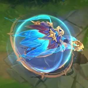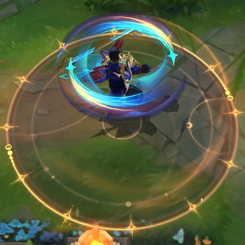 回城时,贾克斯用权杖的力量调出三个环状的星盘,并以自身为中心重新调理紊乱的行星轨道。完成时贾克斯会变成通体亮蓝的星神形态,然后传送落地至泉水中。