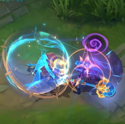 贾克斯高速挥舞他的权杖,形成强大的引力吸引周围群星,利用脚下星盘的刻度与方位,贾克斯会重新调理它们的运行轨迹以形成一个新的星系,期间他会闪避所有敌方的普攻效果。