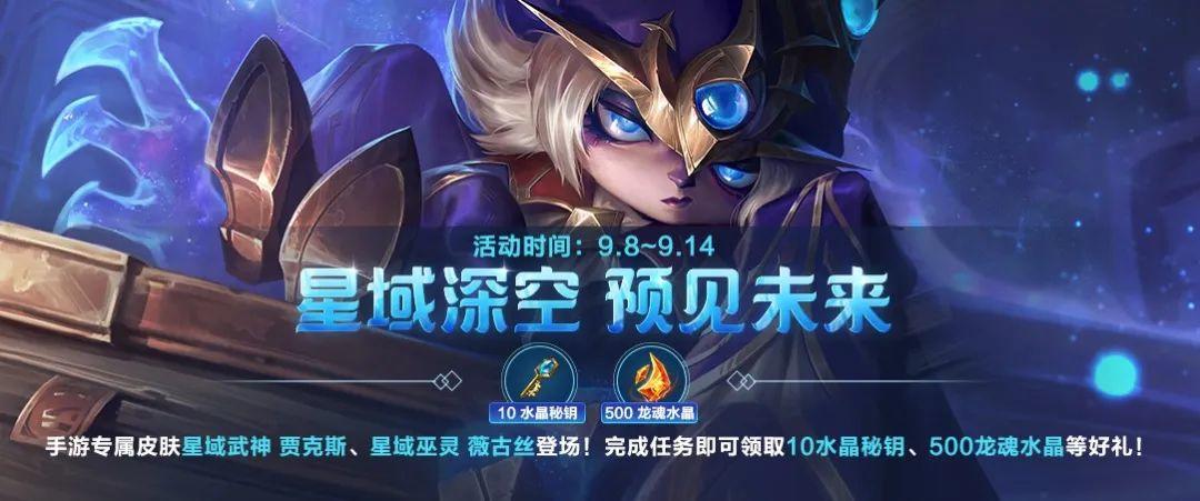 9月8日-9月14日,“星域深空 预见未来”活动上线,活动期间召唤师可通过完成任务,获得水晶秘钥*10+龙魂水晶*500的奖励~具体任务详情可在活动上线后于游戏内查看。