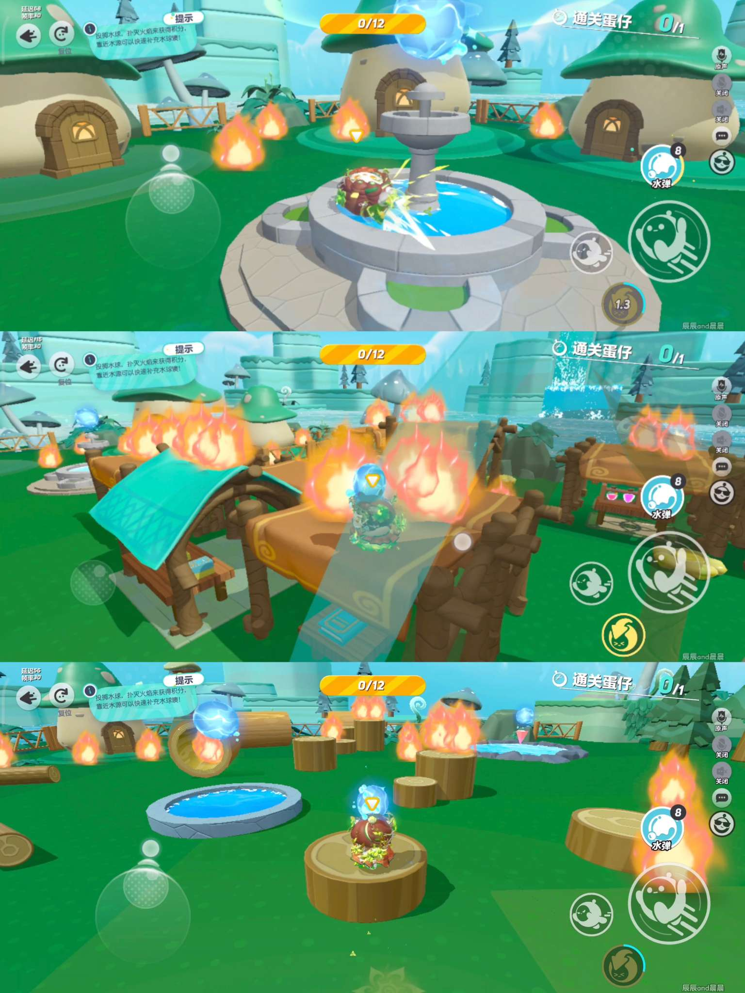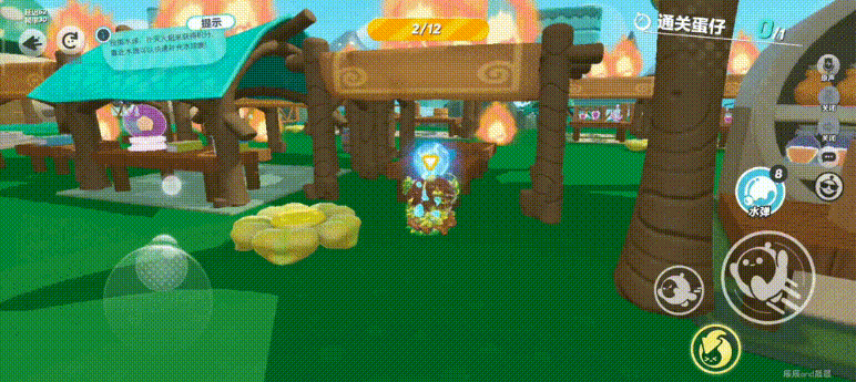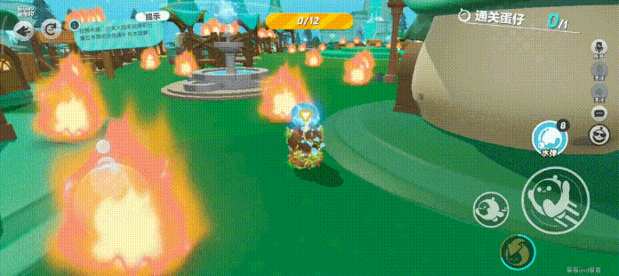 这个积分赛的图也是非常有意思,我们需要先找到地图里燃烧的火焰,用手里的水球去灭火,灭掉一丛火焰就积一分,累计12分通关。