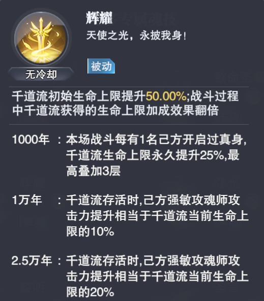 然后这里稍微补充下SP千道流本源魂环中的几个效果:35万年本源可以让长图1-1技能的上限提升1层达到6层;40万年可以进一步提升生命上限;不过45万年本源在同时上阵海魔女会导致海魔女无法掉血,所以大家在长图带海魔女的前提下,不要让SP千道流带超过45万年的本源魂环即可。