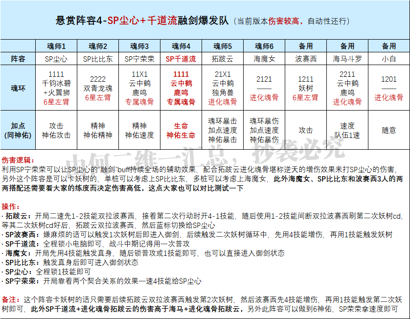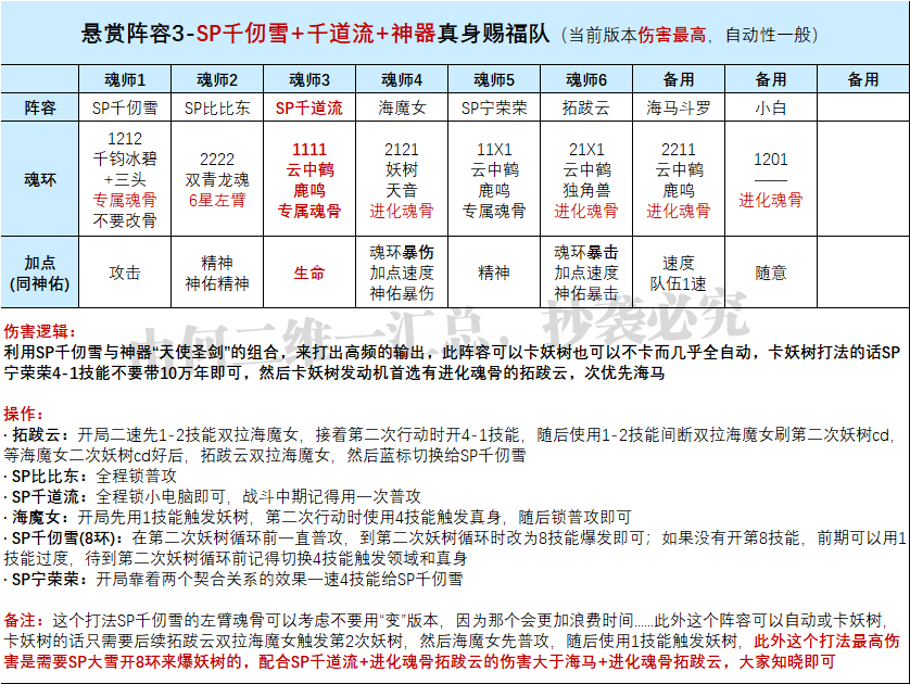 然后是长图部分,SP千道流的统一魂环配置为1111+云中鹤+独角兽等增伤5/6魂环,魂环属性和加点都为生命即可。