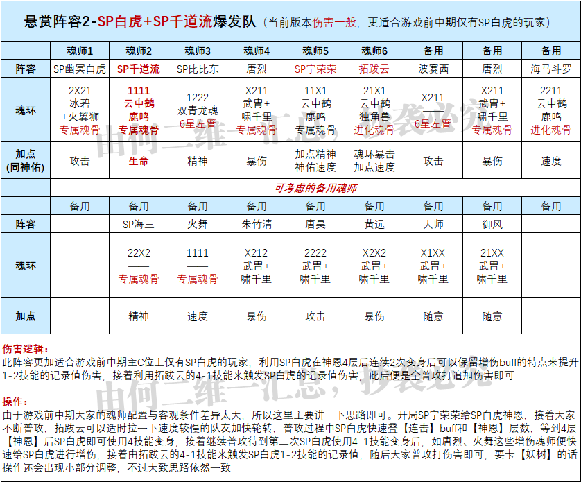 第三个阵容是SP白虎+SP千道流的长图阵容,这个阵容客观说会更加适合于前中期只有SP白虎作为长图主C的玩家,当然对于中后期想要利用SP白虎来打伤害的朋友而言也是可以参考的,另外之前维一就提过了,因为目前SP白虎的长图伤害的确要弱于其余主C,因此这个阵容作为过度是可以的,但后续如果SP白虎没有质变的话,可能此阵容也会逐步成为历史的尘埃,大家注意即可。