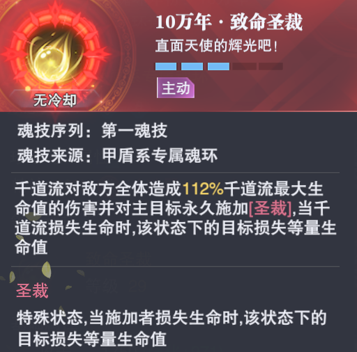 而SP千道流的PVP关键技能就是1-2和2-2两个技能,其中1-2技能能够赋予敌人的【圣裁】效果是非常恶心的,对于敌人的主C或关键辅助可以优先施加,有时千道流都没啥事,但对面就直接挂了......
