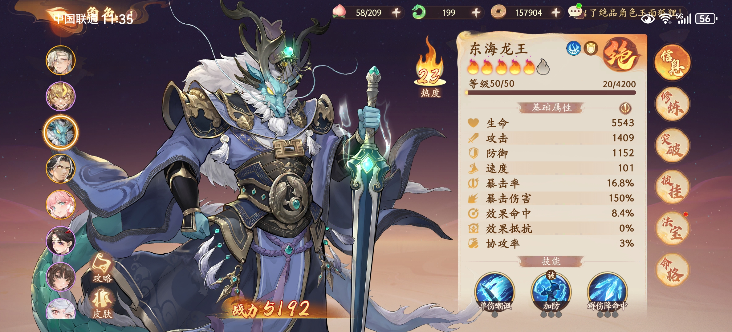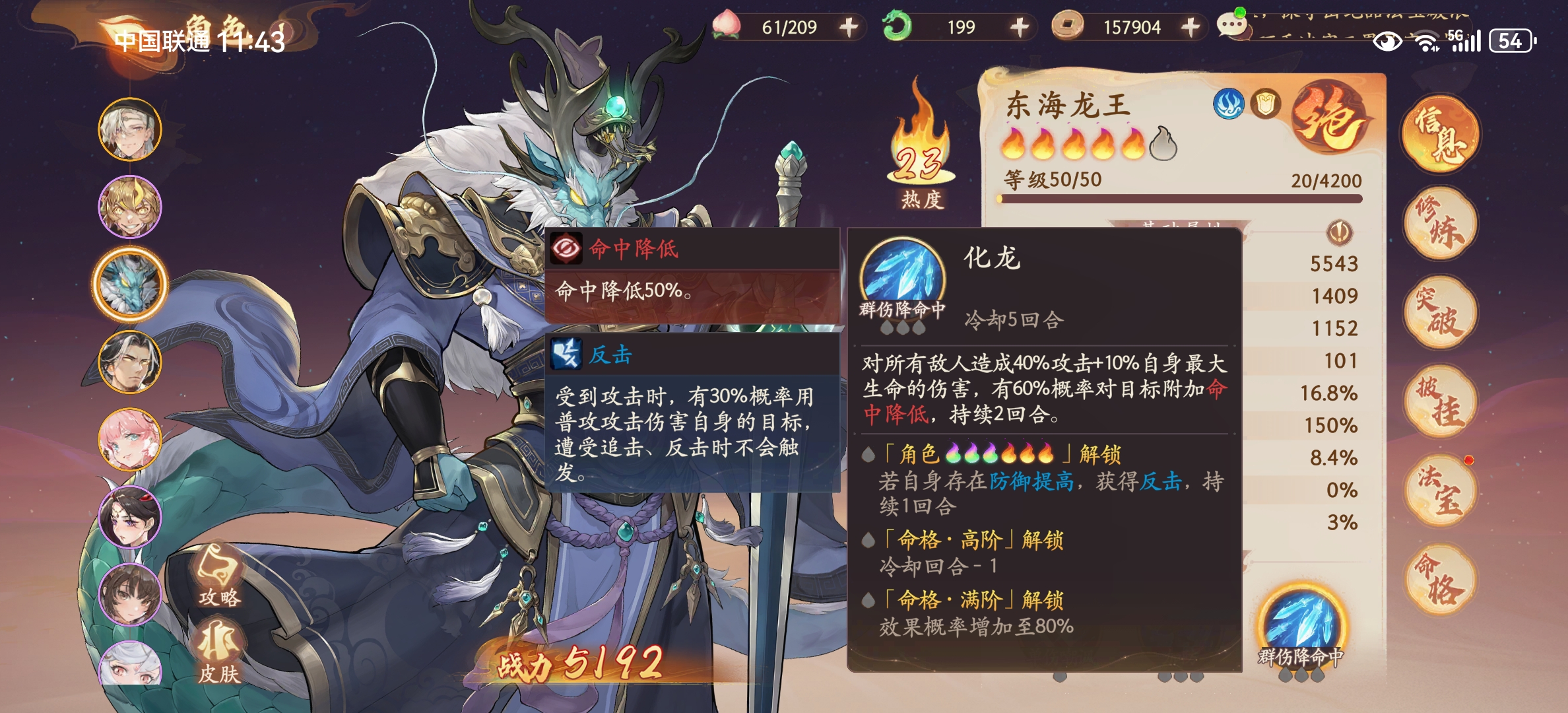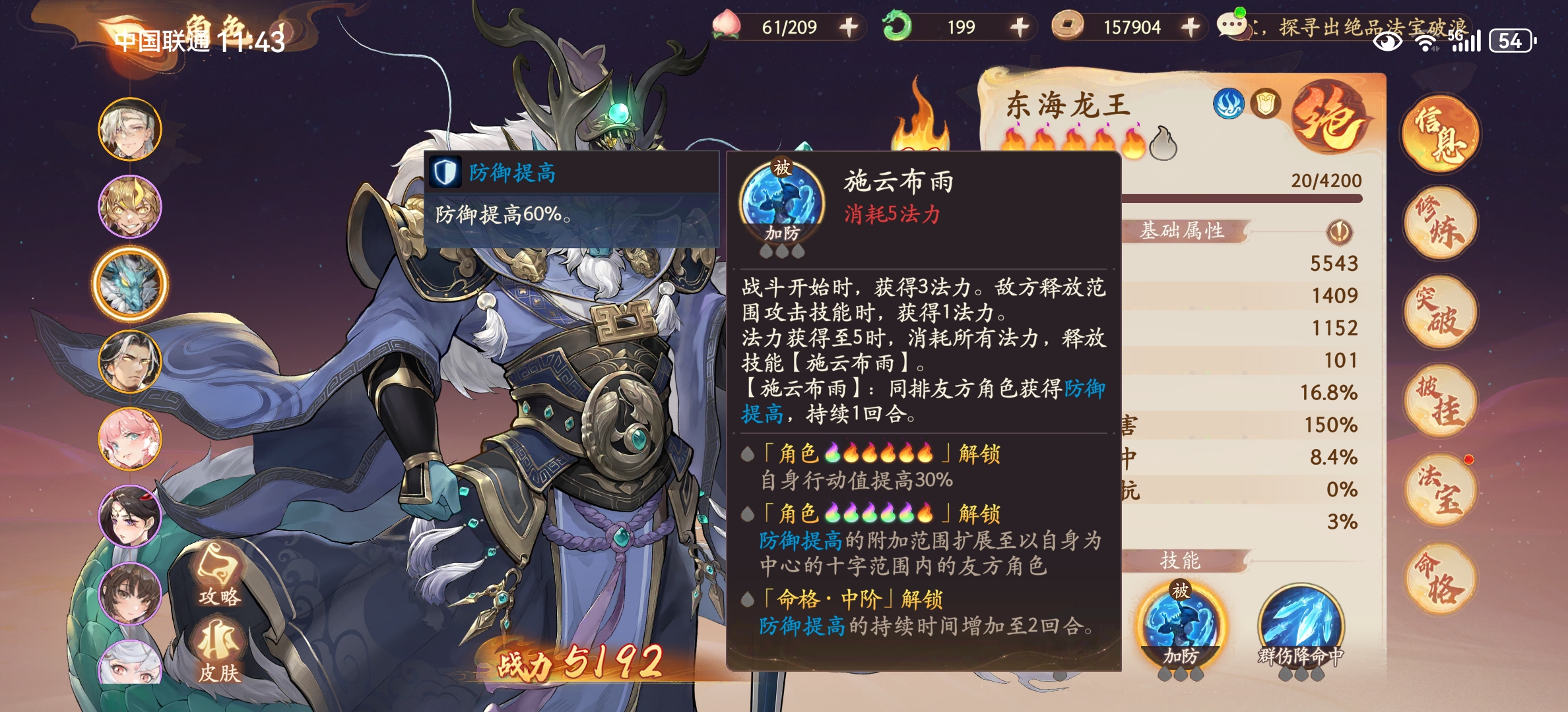 从出货效果来看的话,东海龙王在九星的时候,技能效果会获得非常强大的能力提升,在拥有防御加成的时候可以获得反击状态,通过反击来给目标施加嘲讽。七星的时候可以增加自身的行动值,算是一个小的突破。11星的时候可以增加后排的一个目标进行防御提升。