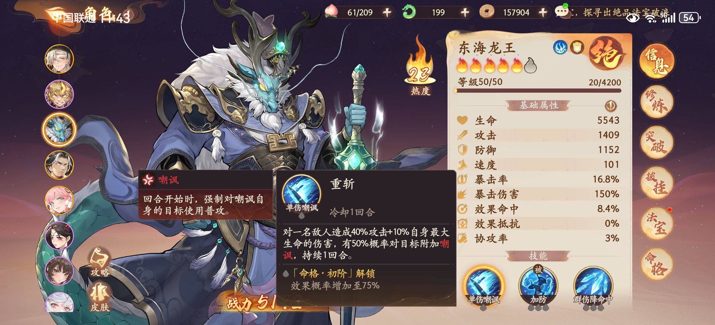 一技能是重斩对一名敌人造成40%的攻击加上10%自身最大生命值的伤害,并且有50%的概率附加嘲讽的状态。被附加嘲讽状态的目标,在回合开始时会强制使用普攻。