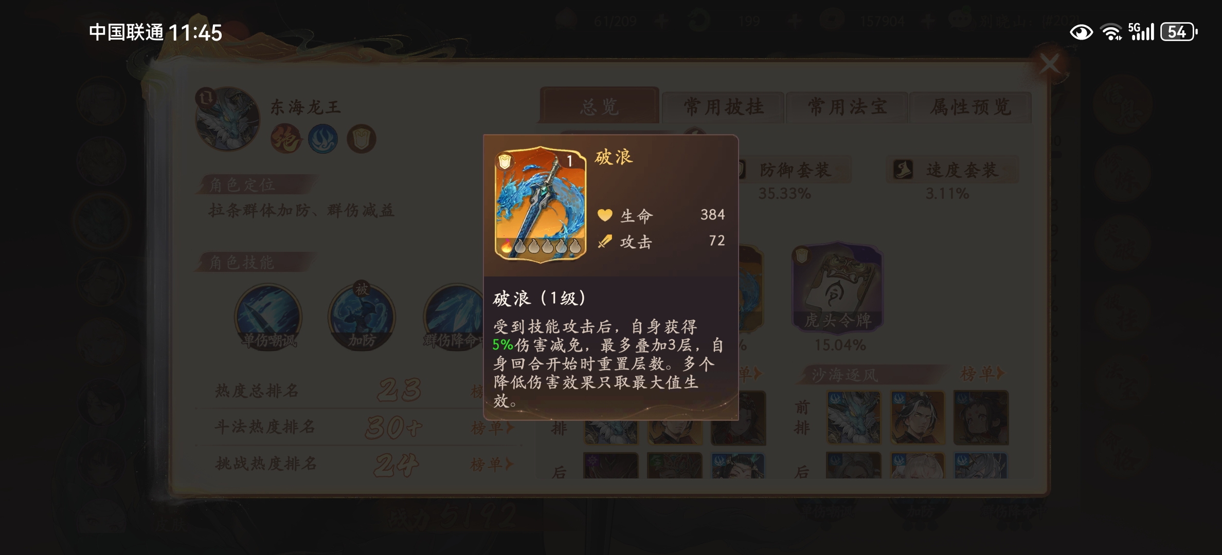 在法宝上的选择,这里推荐专属装备破浪。破烂的效果为受到技能攻击后,自身获得5%的伤害减免,最多可以叠加三层。自身回合开始时重置层数,多个降低伤害效果指取最大。这个专属装备的话,可以增加东海龙王的生存能力。