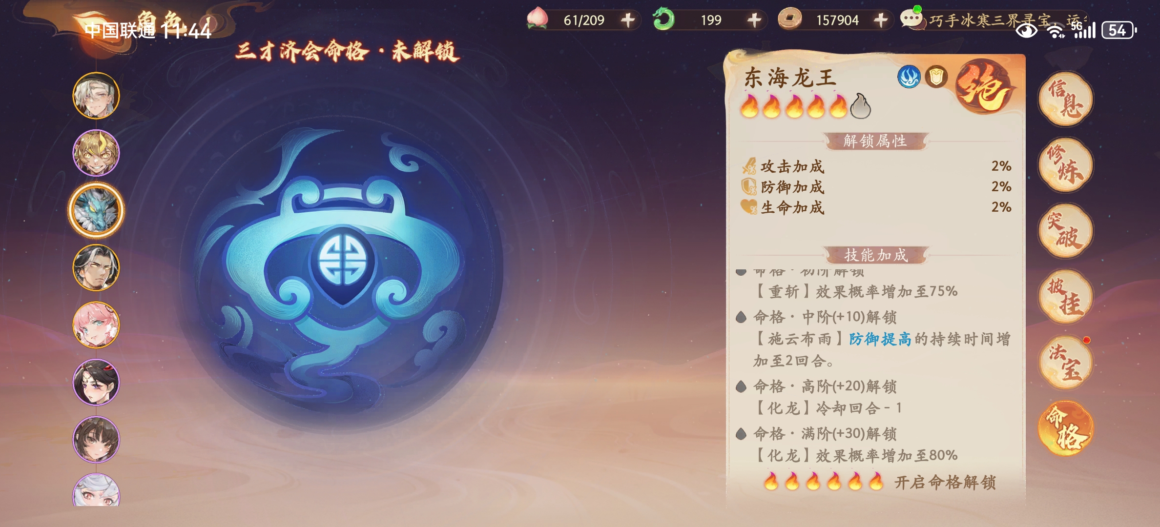 披挂方面可以选择携带生命套装。PVP方面可以选择速度套装。这里还是推荐携带生命套装,毕竟是前排升的套装,可以增加大量的生命来提升东海龙王的生存能力,坦度。而且东海龙王的普攻附带的嘲讽效果可以集中对方的火力,需要自身拥有足够的坦度来应对对面的集火攻击。5.命格