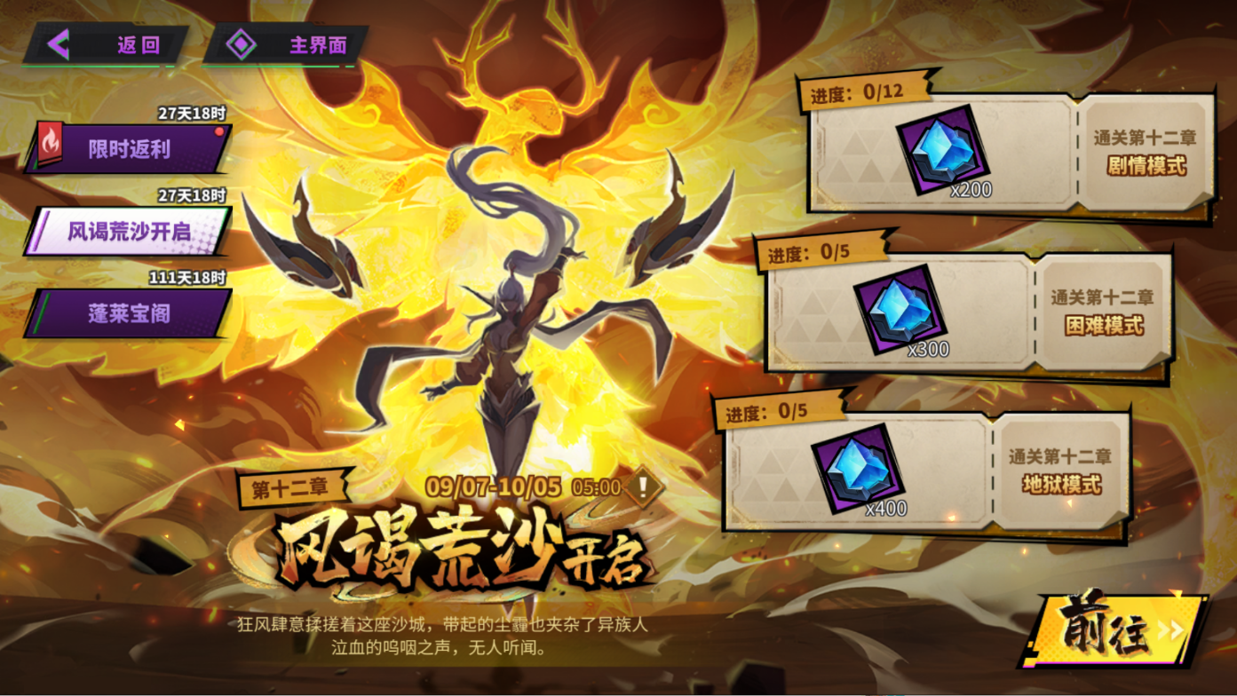 本次更新后,第十二章主线的剧情模式、困难模式和地狱模式永久开放。活动期间推完主线赢奖励!