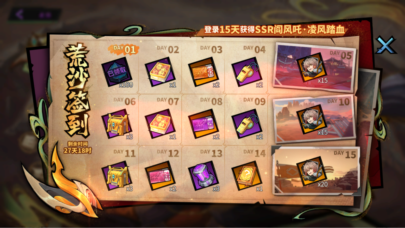 活动期间,镇魂将每日进行签到可领取奖励(最高可领取15天奖励),奖励包含「灵魂碎片·凌风踏血」「灵将契约券」「武器锻造券」「魂晶」等道具,累计可得「灵魂碎片·凌风踏血」×50!