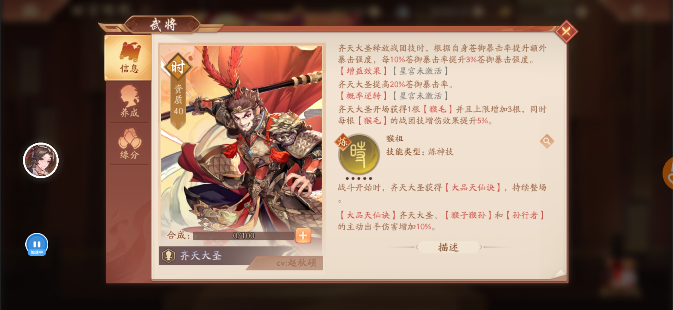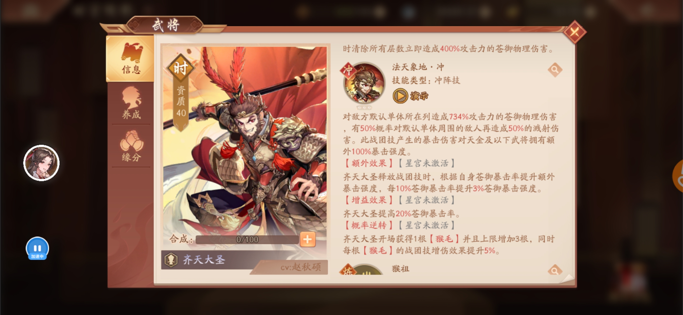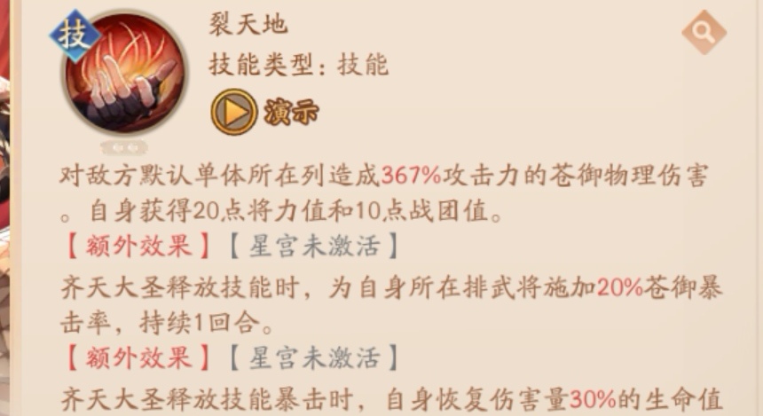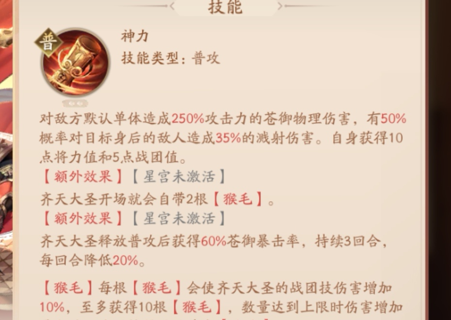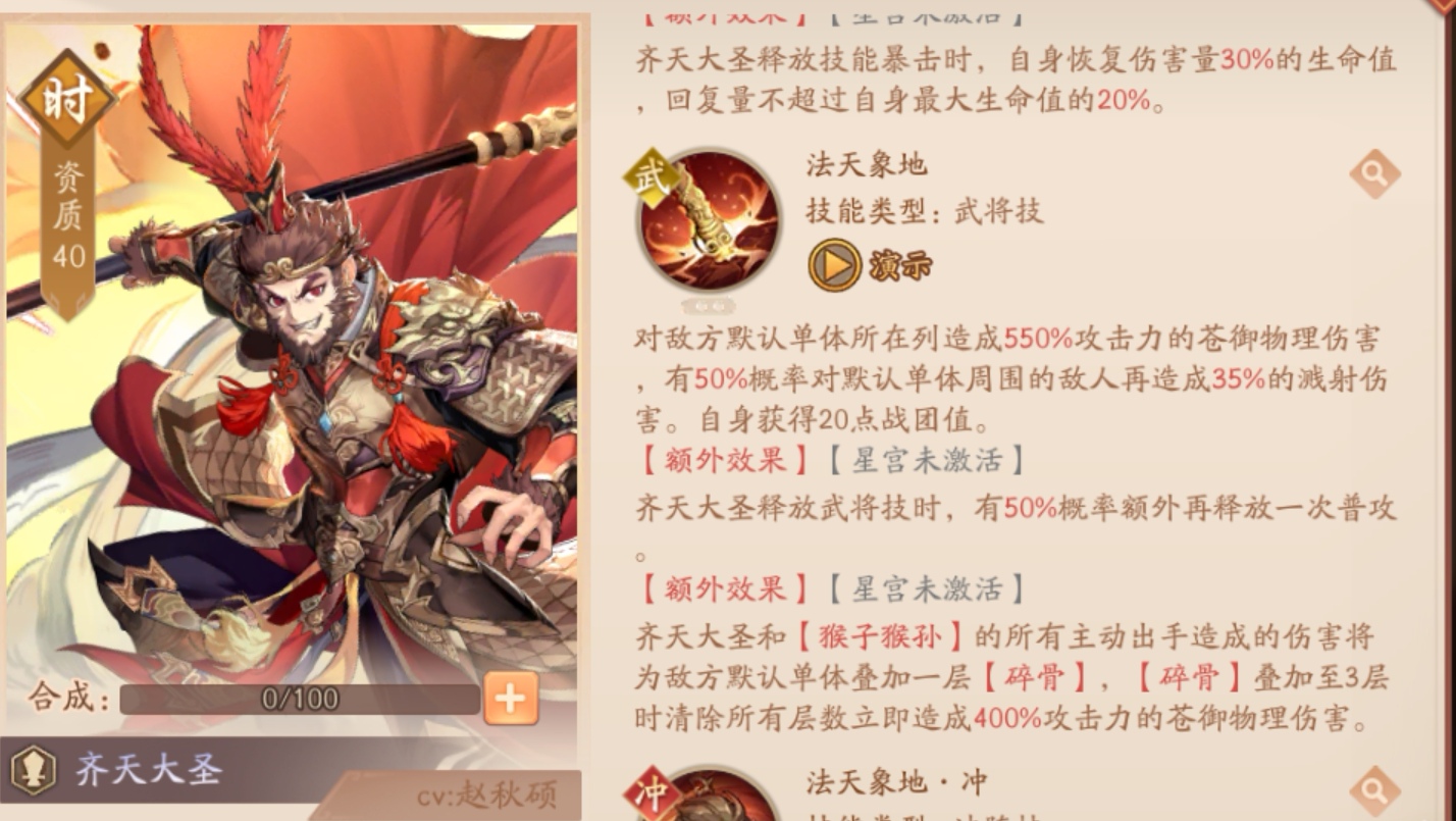 武将技也少了一个星宫,有溅射的伤害,星宫星宫还是厉害的,不过猴子猴孙这个介绍也没找到,不知道是后续出还是升星才有