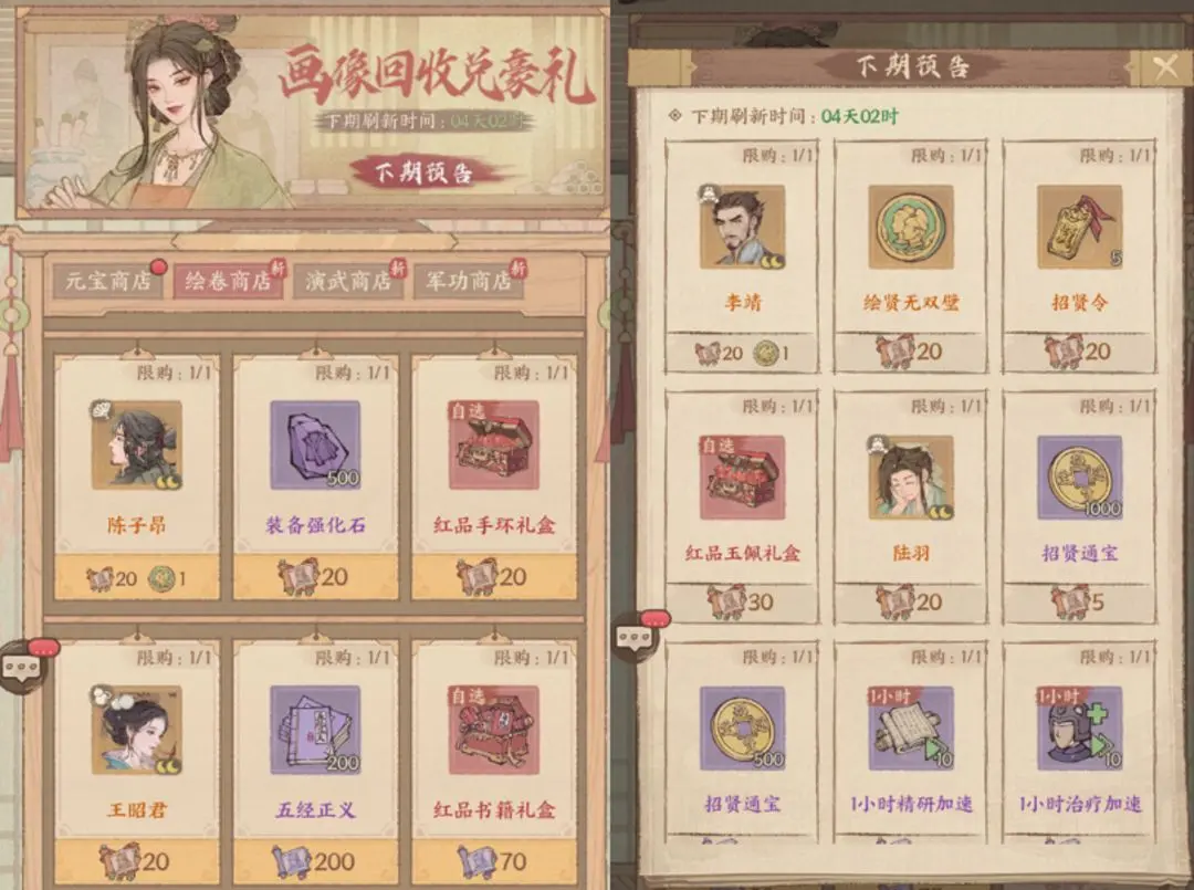 绘卷商店每期可以兑换不同的道具!请城主们敬请期待~