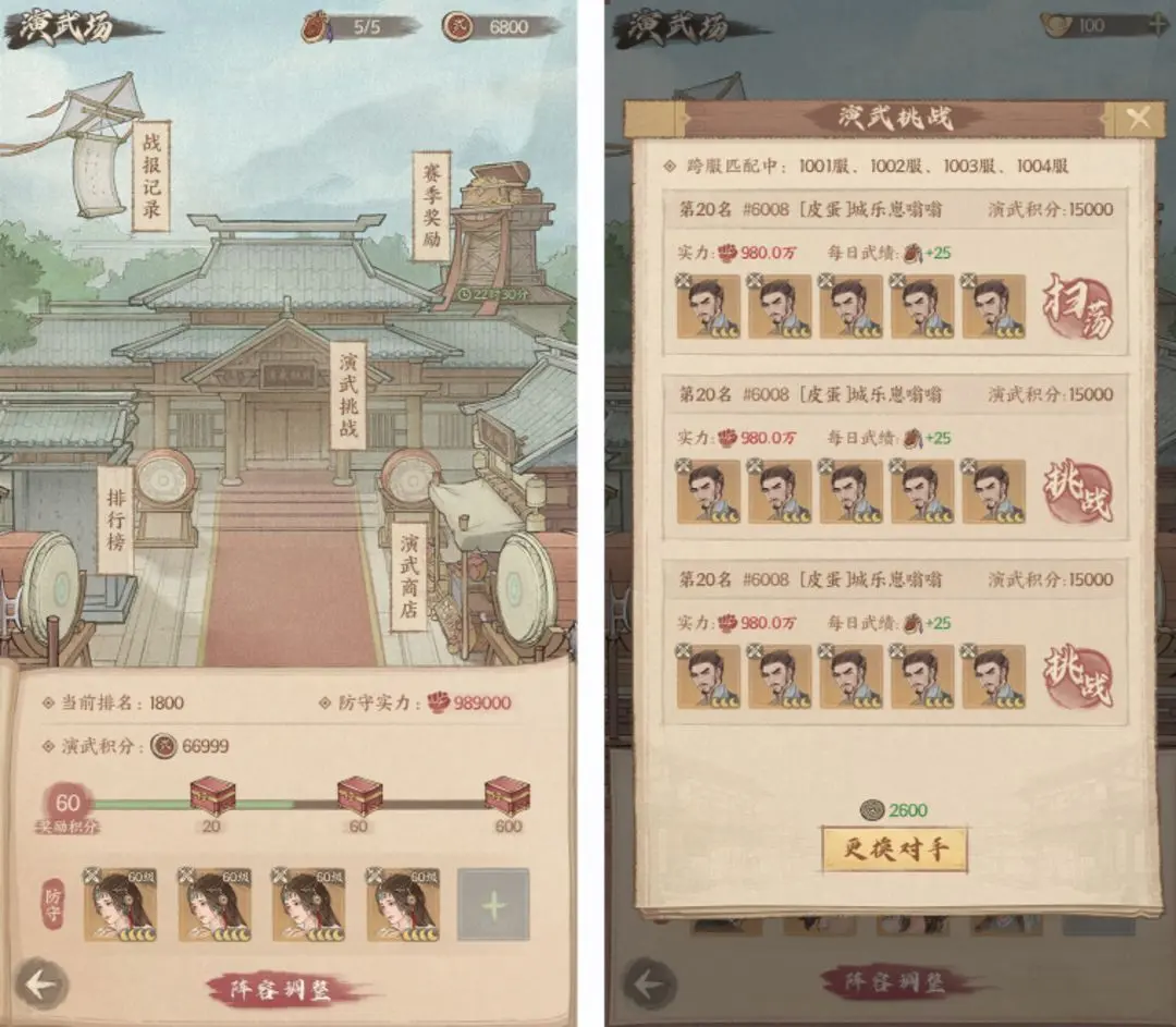 竞技场不应只有本服竞技,还应当有跨服类型的竞技,全平台同台角逐,强者名声不止局限于本服,更要响彻整个跨服,故我们更是推出了『跨服演武场』,『跨服演武场』主要考验城主们在大环境下,如何拔得头筹,当然作为回馈,拔得头筹的城主将享受到丰厚的奖赏!