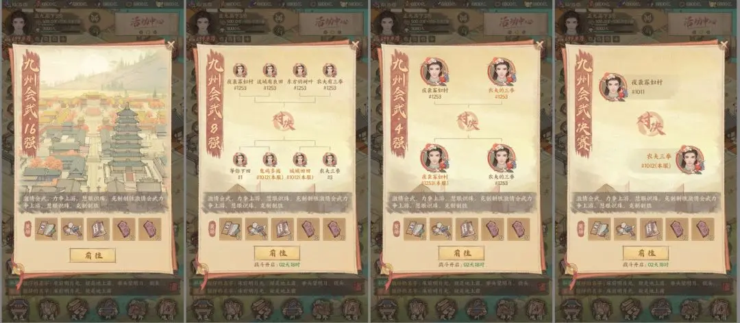 比赛将持续7天。经历海选赛、淘汰赛等重重关卡,最后进入总决赛获得至尊荣耀!大赛第一名的城主将获得专属称号,所有参与『九州会武大赛』的城主都将获得获得大量奖励。