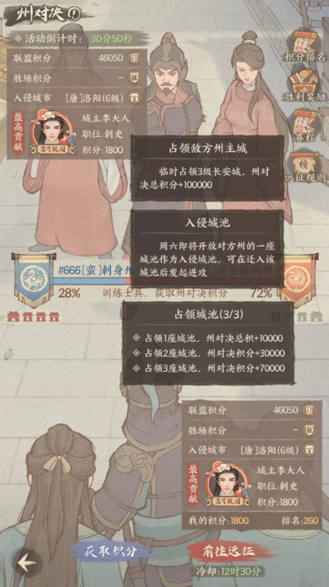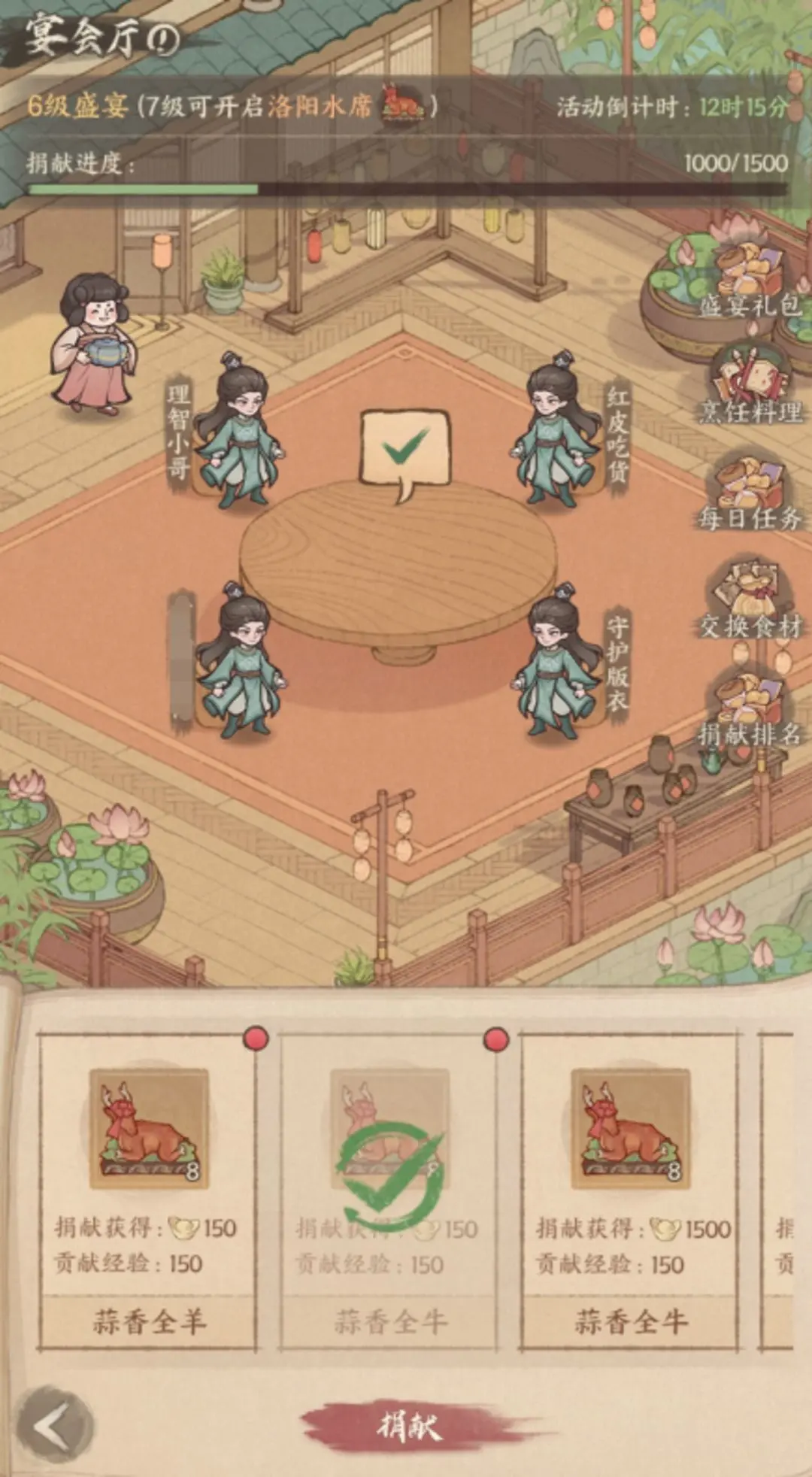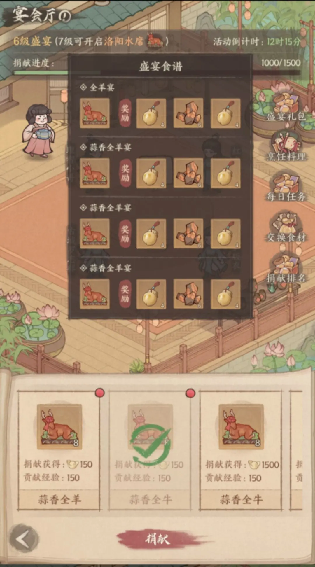 同时捐献食物同时可提升单期活动内的州盛宴等级,州盛宴等级每提升一级,全州成员可点击设宴,设宴后可获得元宝和招贤通宝奖励!