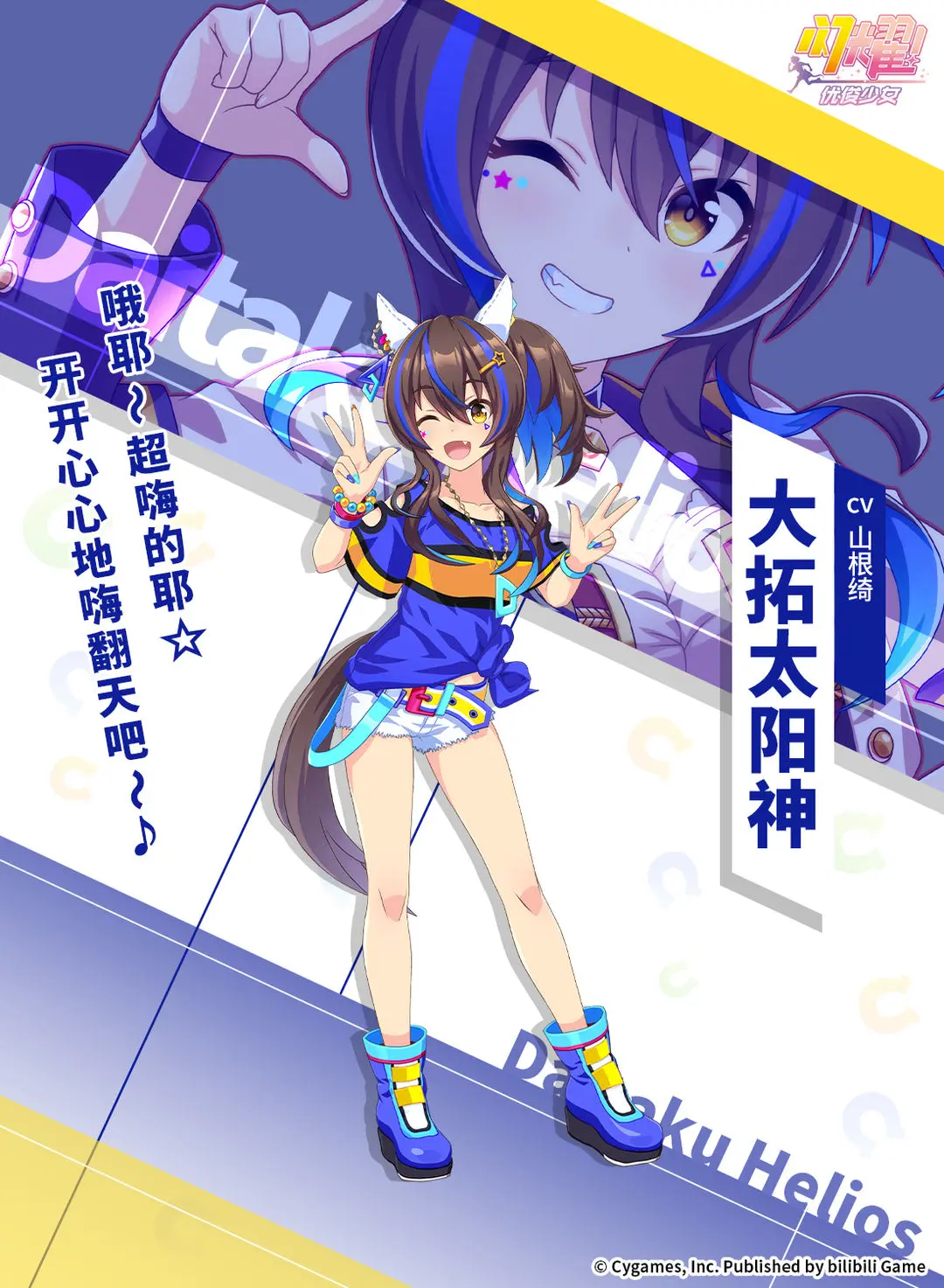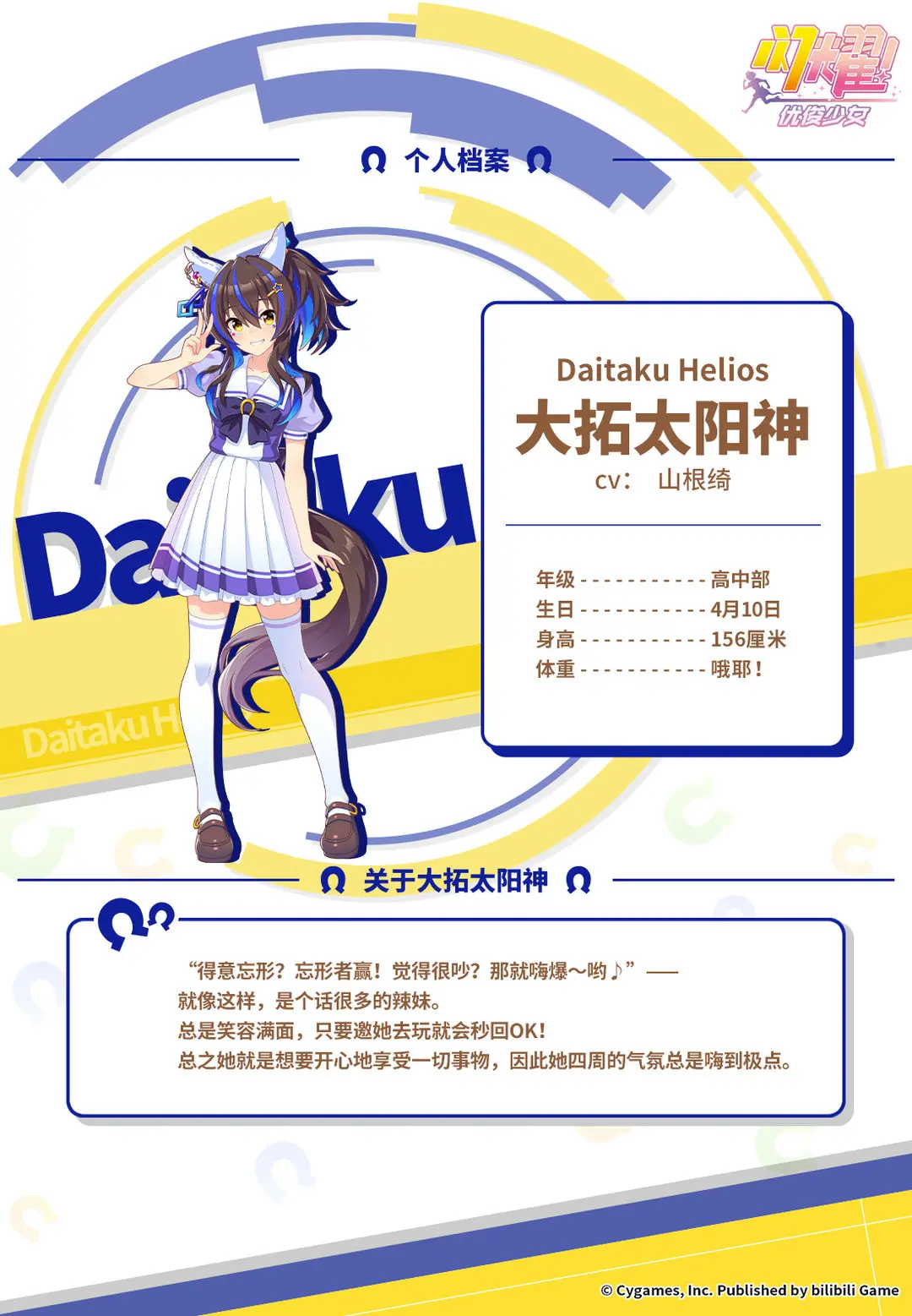 ✦特雷森学园档案║大拓太阳神✦白喵岚岚发布于 2023-09-08关注 姓名--大拓太阳神(CV:山根绮)年级--高中部生日--4月10日身高--156厘米体重--哦耶!“得意忘形?忘形者赢!觉得很吵?那就嗨爆~哟♪”——就像这样,是个话很多的辣妹。总是笑容满面,只要邀她去玩就会秒回OK!总之她就是想要开心地享受一切事物,因此她四周的气氛总是嗨到极点。“哦耶~超嗨的耶☆开开心心地嗨翻天吧~♪”今后也请多多支持《闪耀!优俊少女》!