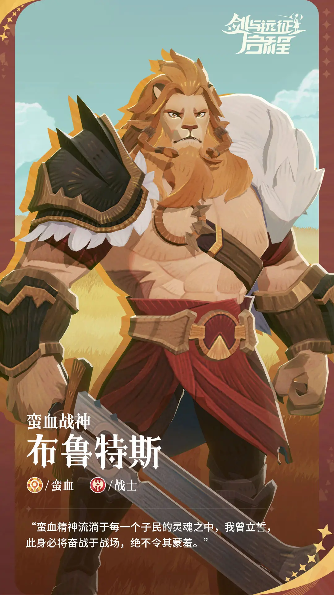 【英雄情报】蛮血战神 布鲁特斯剑与远征2:旅程 - 新闻星发布于 2023-09-08关注布鲁特斯是蛮血部族有史以来的最强者他在战场上浴血奋战所向披靡的威猛雄姿为他迎来了「战神」的尊称在他的身上,你能看到蛮血部族最宝贵的精神:坚韧、勇猛、不屈——以及无穷无尽的对战斗和胜利的渴望