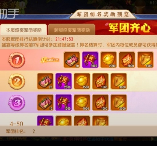 2张截屏可以看出。个人得到的功绩点是一样的。实际里面有非常大的学问。缺少羊排奖励。那么对于后面火锅等级有非常大的影响。如果是第一名军团就缺少12万火锅经验。相当于少一级火锅。这一次更新。等于直接提高提升火锅等级的难度。从火锅等级奖励获取的功绩点+孔明灯+精炼石就会减少。这相当于变相减少玩家的功绩点~资源。