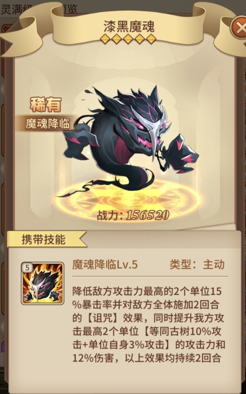 降低敌方攻击最高两单位暴击率,同时提升我方攻击与伤害能力,附带诅咒效果。在PVP与PVE中使用都很多,效果很简单,提升我方输出能力,对于主打爆发的队伍很适合,能够支撑其打出高伤害。光法队、红莲哪吒队、怒涛波塞冬队、暗法队均可使用,通用性很强,一般PVP没他的格子,打天界副本可以使用。