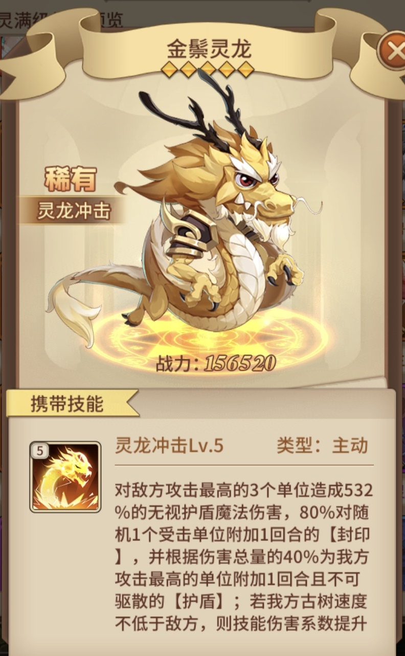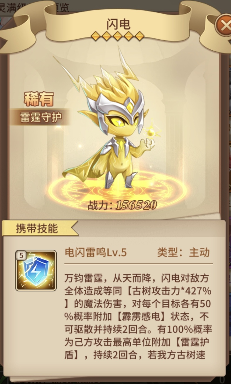 闪电攻击敌方全体,高概率附加霹雳感电效果(霹雳感电驱散不了,稳定两回合在场,可与感电效果共存)。此外根据伤害量生成雷霆护盾,提升我方单位抗暴概率及带来终伤减免效果(不被驱散下非常强)。类似金龙,护盾是否驱散会受古树速度影响。使用冥牙芬尼尔的队伍也会一回合使用以保证冥牙芬尼尔的生存;人马队也会考虑一回合使用,利用感电效果进行多次触发,点杀敌方单位,但现在人马用的更多的还是风龙。