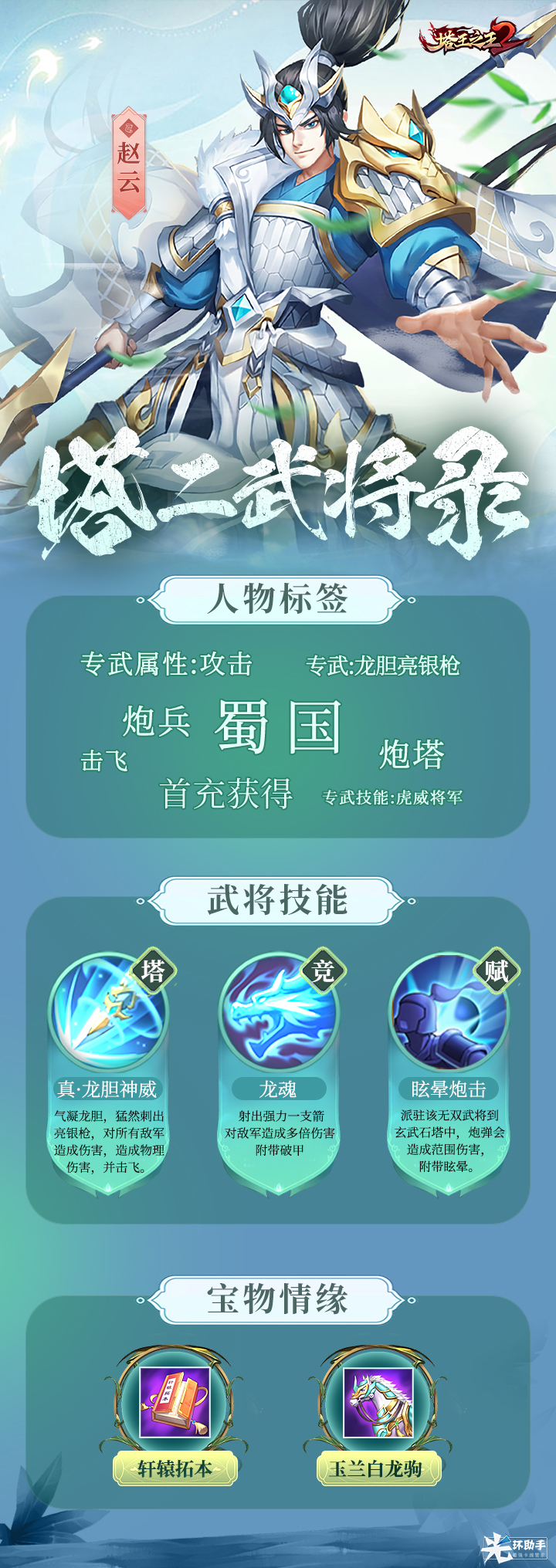《塔王之王2》武将录-炮兵-赵云光环新资讯发布于 2023-09-11关注作为首充即可获得的武将,赵云应该是大家最为熟悉的武将之一啦一起来看看他的技能吧~运营OS:赵云作为目前少有的全图攻击武将,在拥有专武之后战力更上一层,是首充玩家培养首个神将的不二之选哦~ 武将获取途径:抽卡招募、酒馆兑换、竞技商店、试炼商店、远征商店、巅峰商店、天下商店,其他特殊活动等