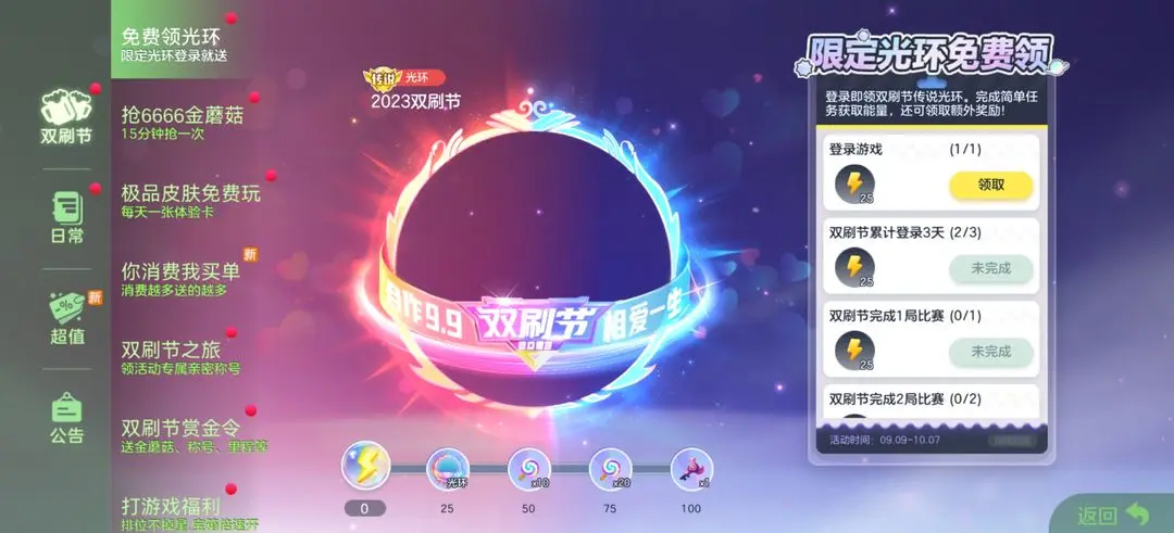 组队双刷,福利加码!登录即可免费领取【双刷节传说光环】!完成简单任务获取能量,领取炫彩棒棒糖、超大奇妙宝箱钥匙等豪华大礼