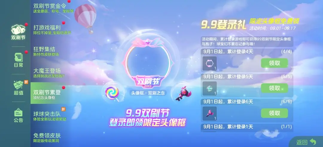99双刷节活动火热进行中,累计登录游戏4天,即可获得99双刷节的限定头像框【双刷之念】和孢子奖励!