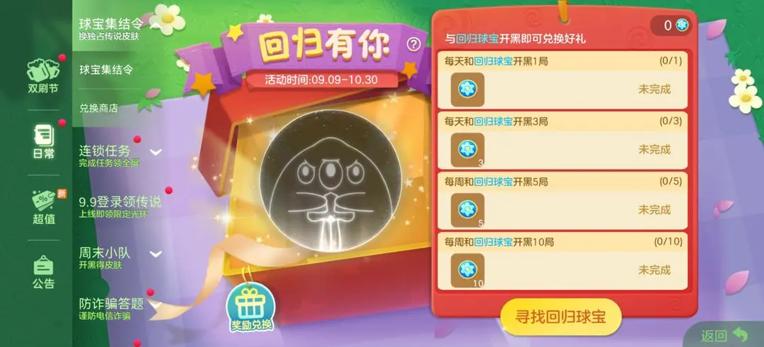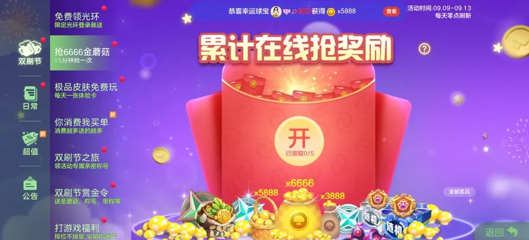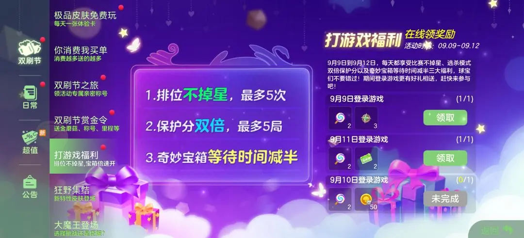 双刷节冲段福利!全天享受排位不掉星双倍保护分以及奇妙宝箱等待时间减半三大福利!助力球宝和双刷搭子轻松上超神!登录游戏更有好礼相送!走,上线!