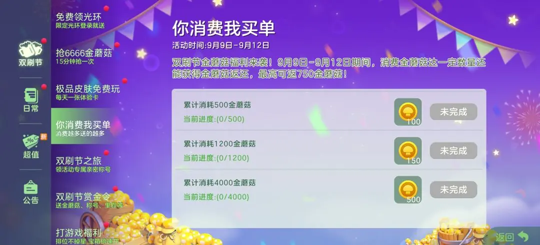 双刷节金蘑菇福利重磅来袭!活动期间,消费金蘑菇达一定数量获得金蘑菇返还,心动不如马上行动快来参与吧~