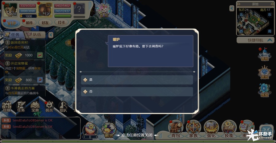之后从旅馆的后门进入夜晚的旅馆,与总负责人对话,获取火石,然后使用火石点燃暖炉,会前往暖炉之底,在暖炉之底竟然存在着一个十分宽广的洞窟,勇士们一路前进,到达洞窟深处后发现原来旅馆闹鬼是亡灵骑士引起的,消灭亡灵骑士,解决旅馆闹鬼吧!