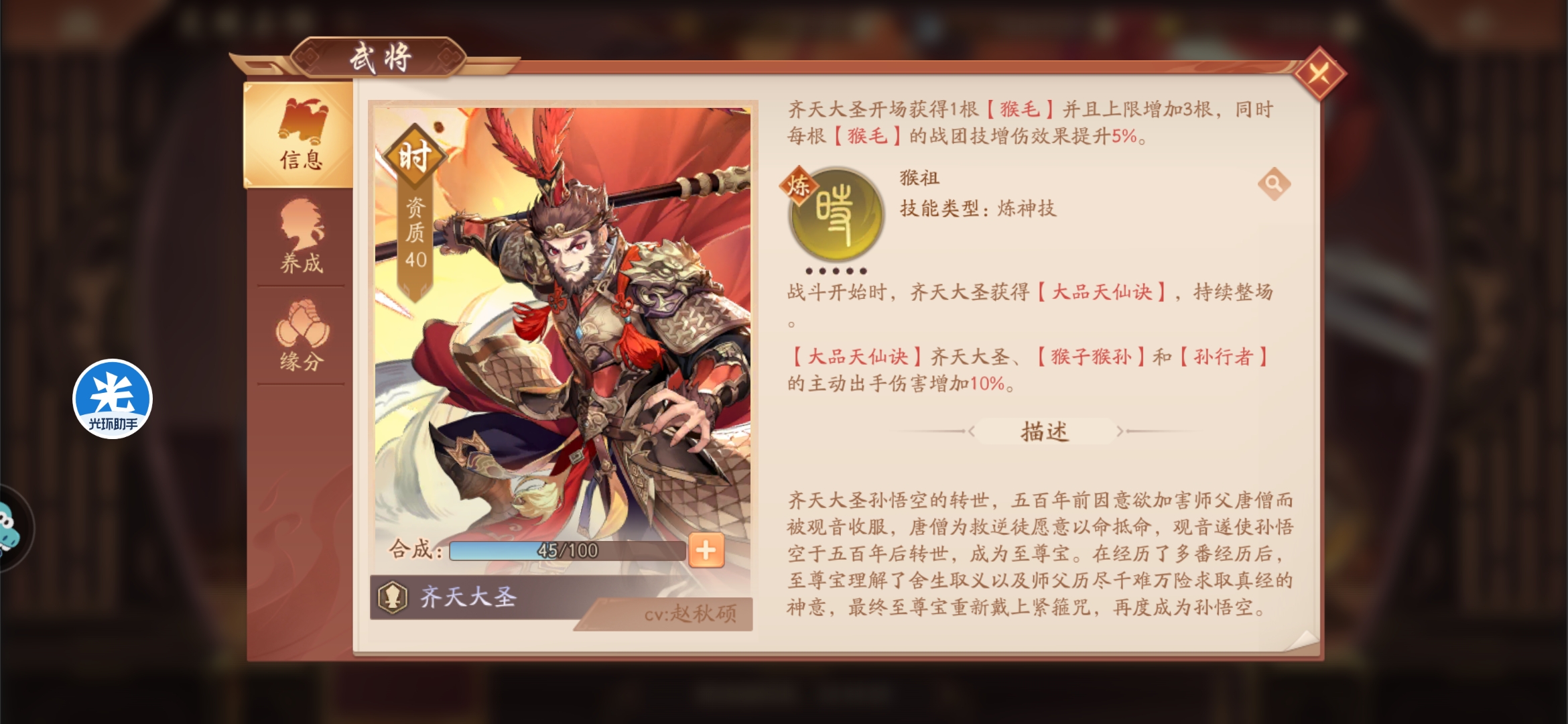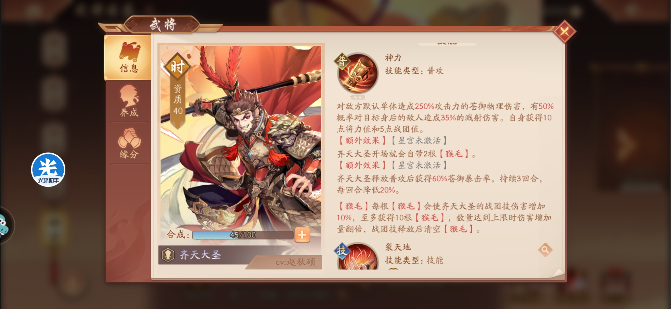 猴毛:每根猴毛会使齐天大圣的战团技伤害增加10%,至多获得10根猴毛,数量到达上限时,伤害增加量翻倍,战团技释放后清空猴毛。