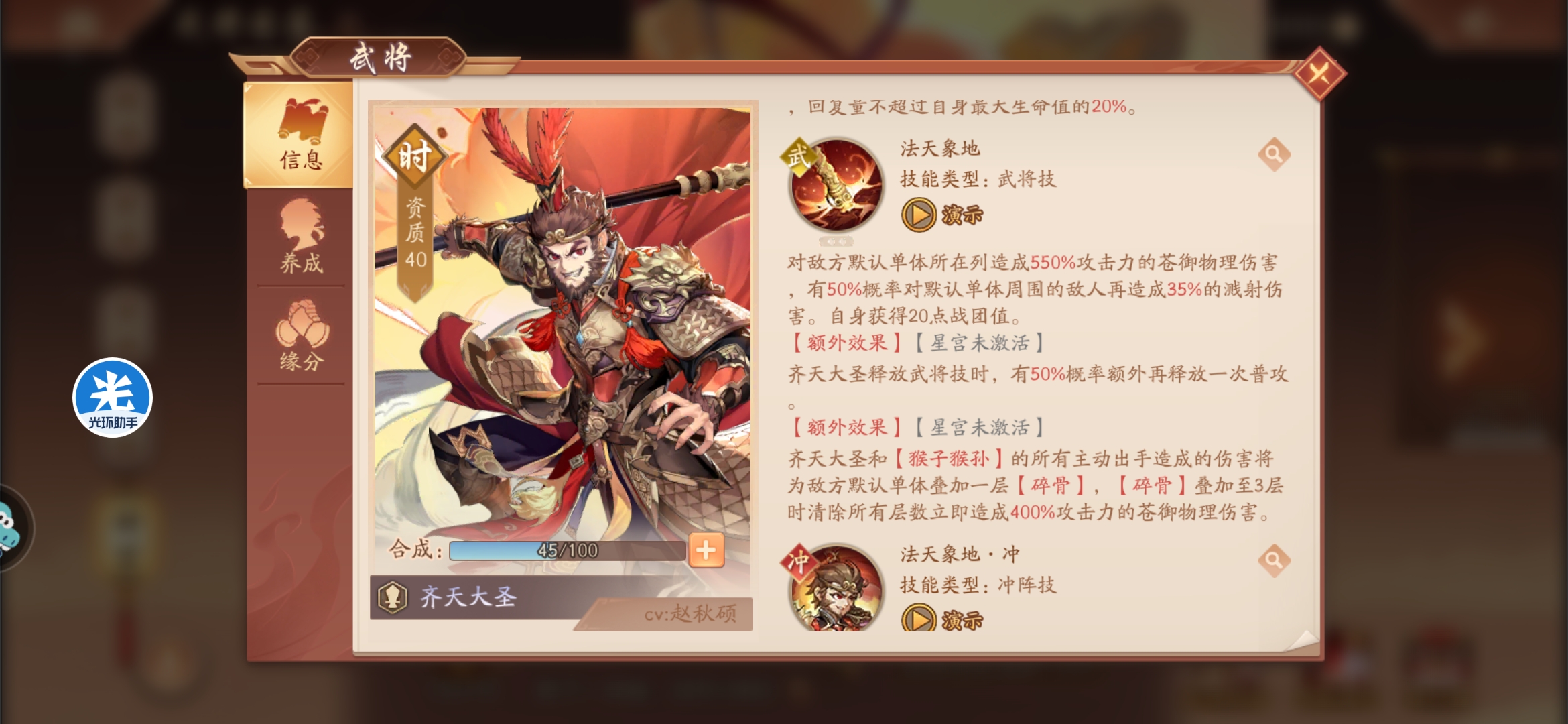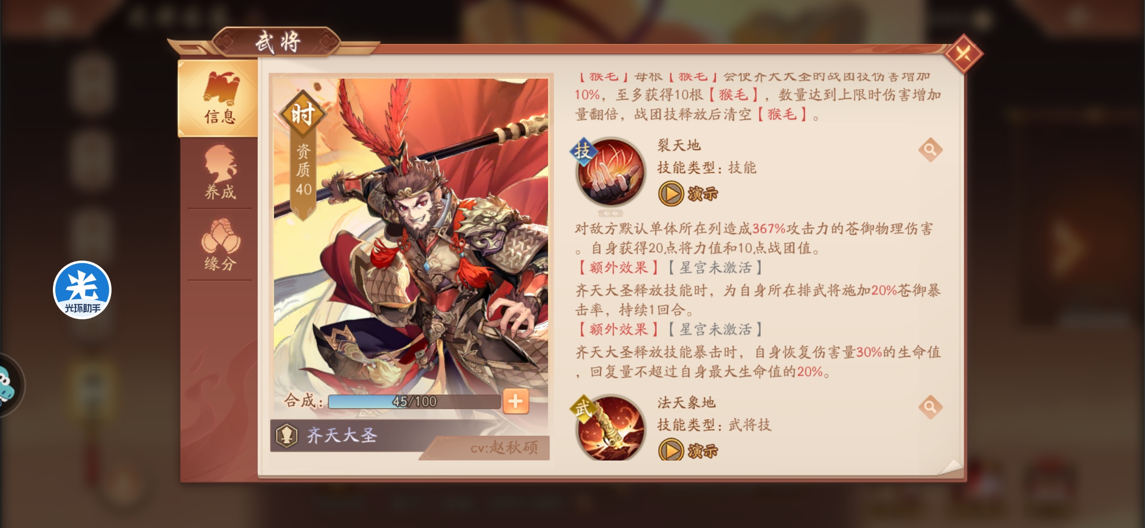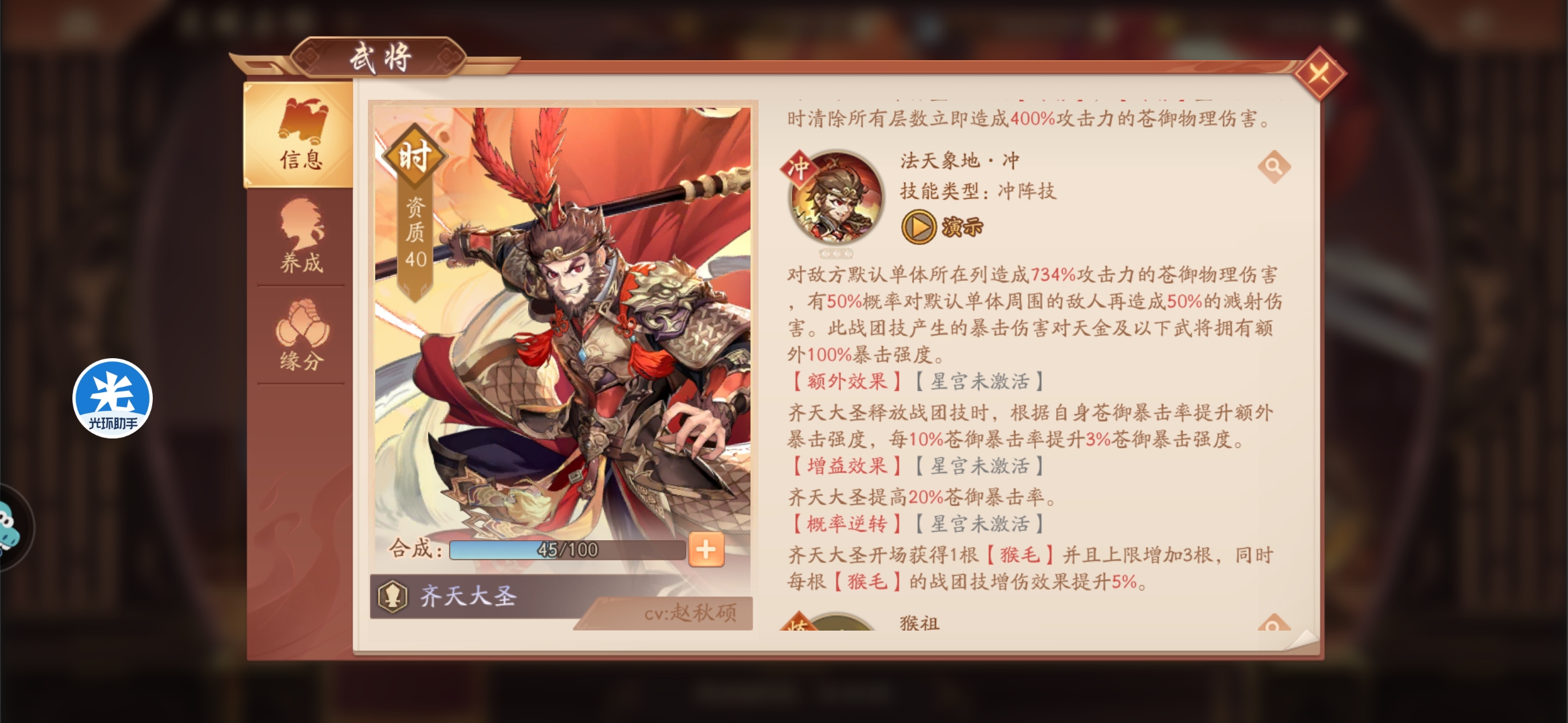 齐天大圣算是第一个将星宫也加入普攻的英雄,普攻来说也相对比较好理解,按照三国志回合制的攻击方式,普通攻击攻击到前三个武将都有50%的概率攻击到和被攻击武将同一列的后一个武将,造成的伤害为前者武将受到伤害的30%。猴毛就更容易理解,每根猴毛增加10%战团技伤害,最多十根猴毛,十根猴毛理论上增加100%战团技伤害,但达到上限伤害会再次翻倍,因此最多增加200%战团技伤害。