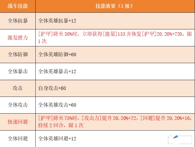征服者的战车技能主要围绕恢复和闪避属性的提升,在一定程度上可以让其成为较为肉的前排英雄,成为后排的坚实的盾,具有不错的持久能力。