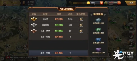 排行榜记录了今日所有阵营的玩家参与国战获得的战功,根据战功排名,每日还会发放排名的荣耀币,荣耀币可在国战商店兑换所需物资,除每日排名奖励外,还有每日战功到一定程度即可领取的每日宝箱奖励,获取一定的游戏资源。
