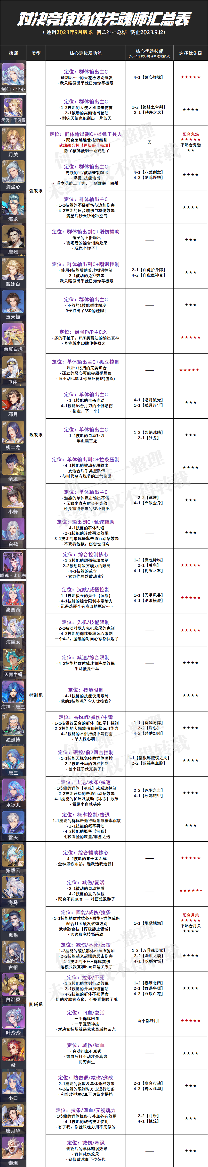最后下表是适用于2023年9月版本的全优选魂师对决竞技场评级,大家可以参考一二。